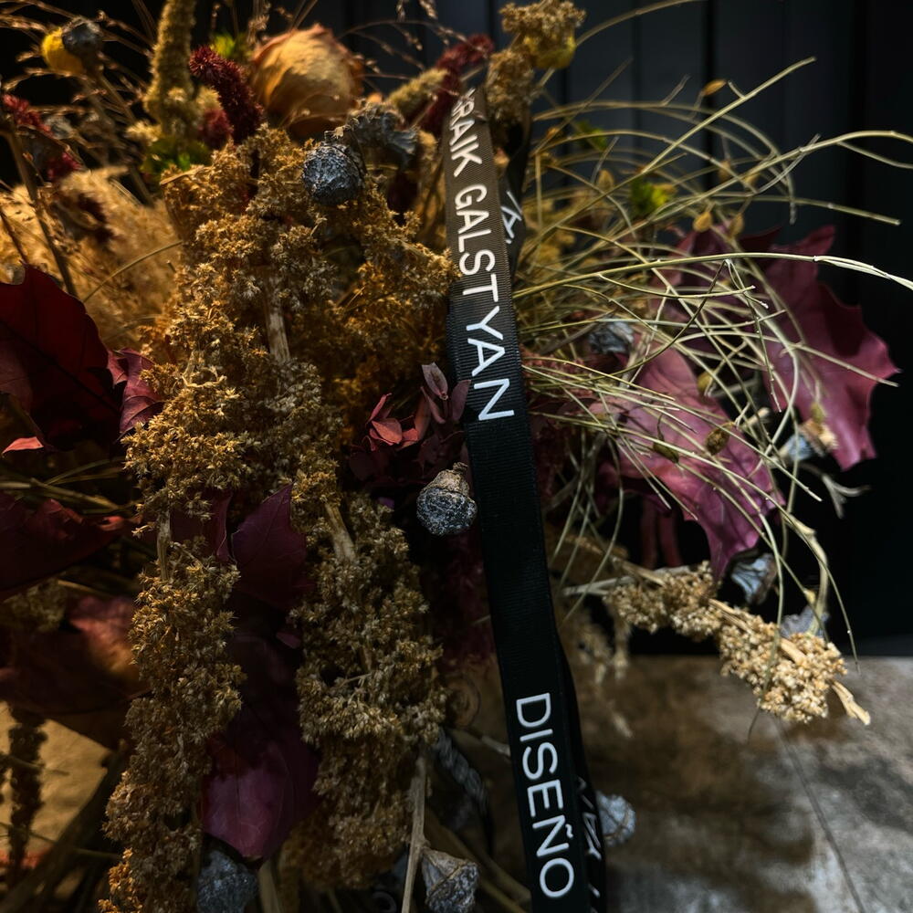 Olive leaves - 3 pcs amaranthus - 6 pcs craspedia - 10 pcs roses - 2 pcs panicum - 10 pcs miscanthus - 5 pcs escabiosa - 10 pcs wild eucalyptus - 10 pcs