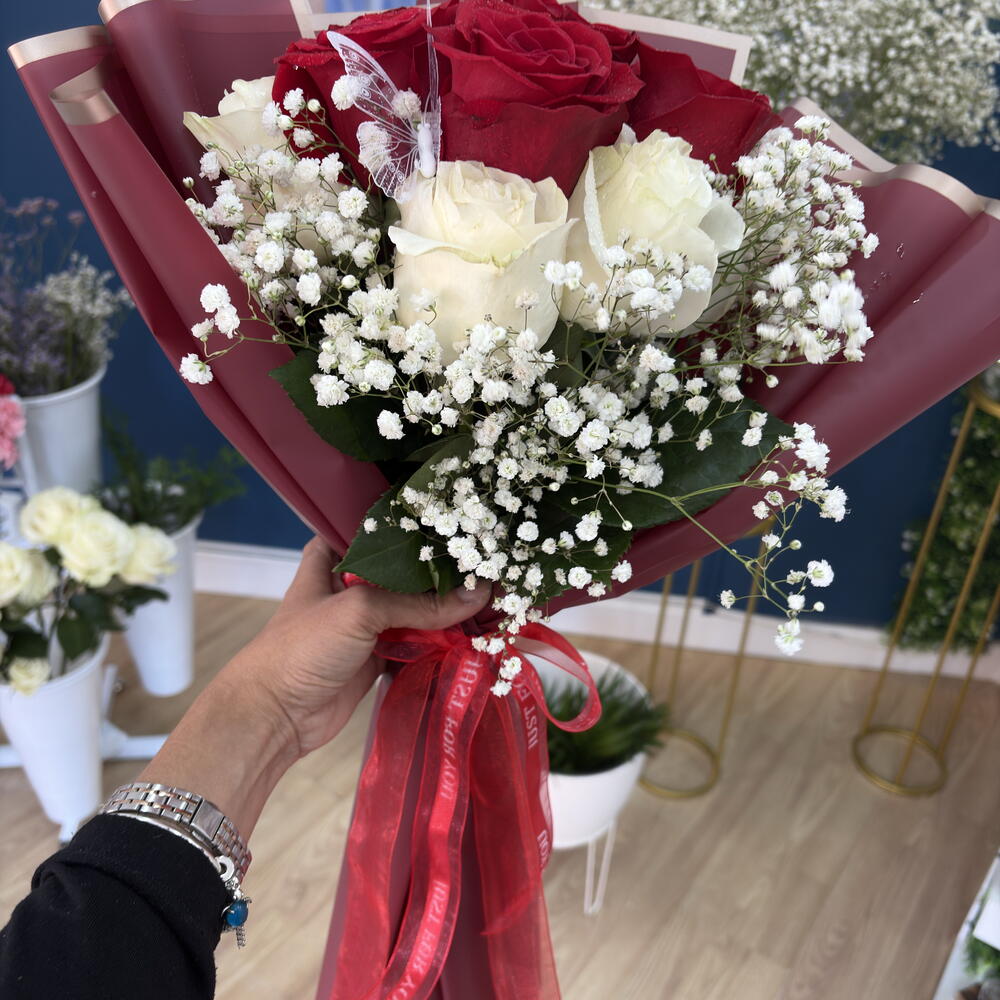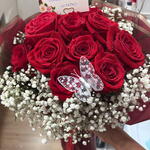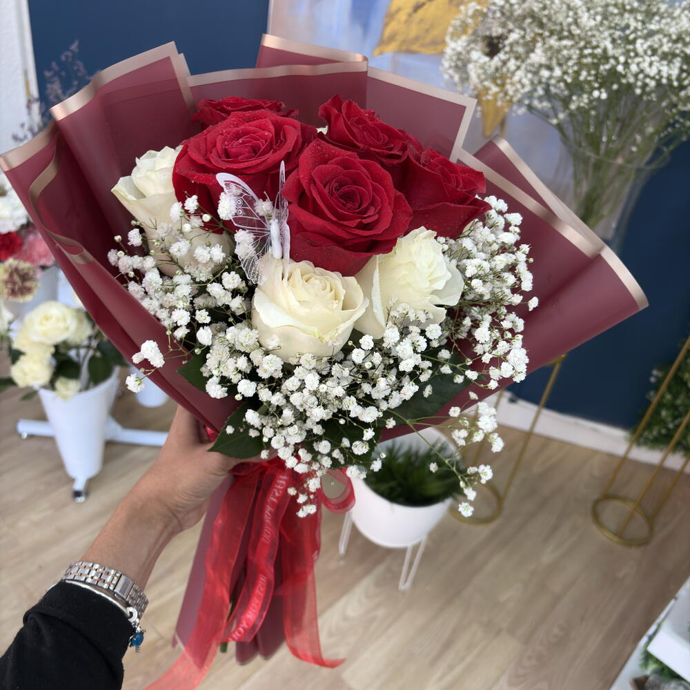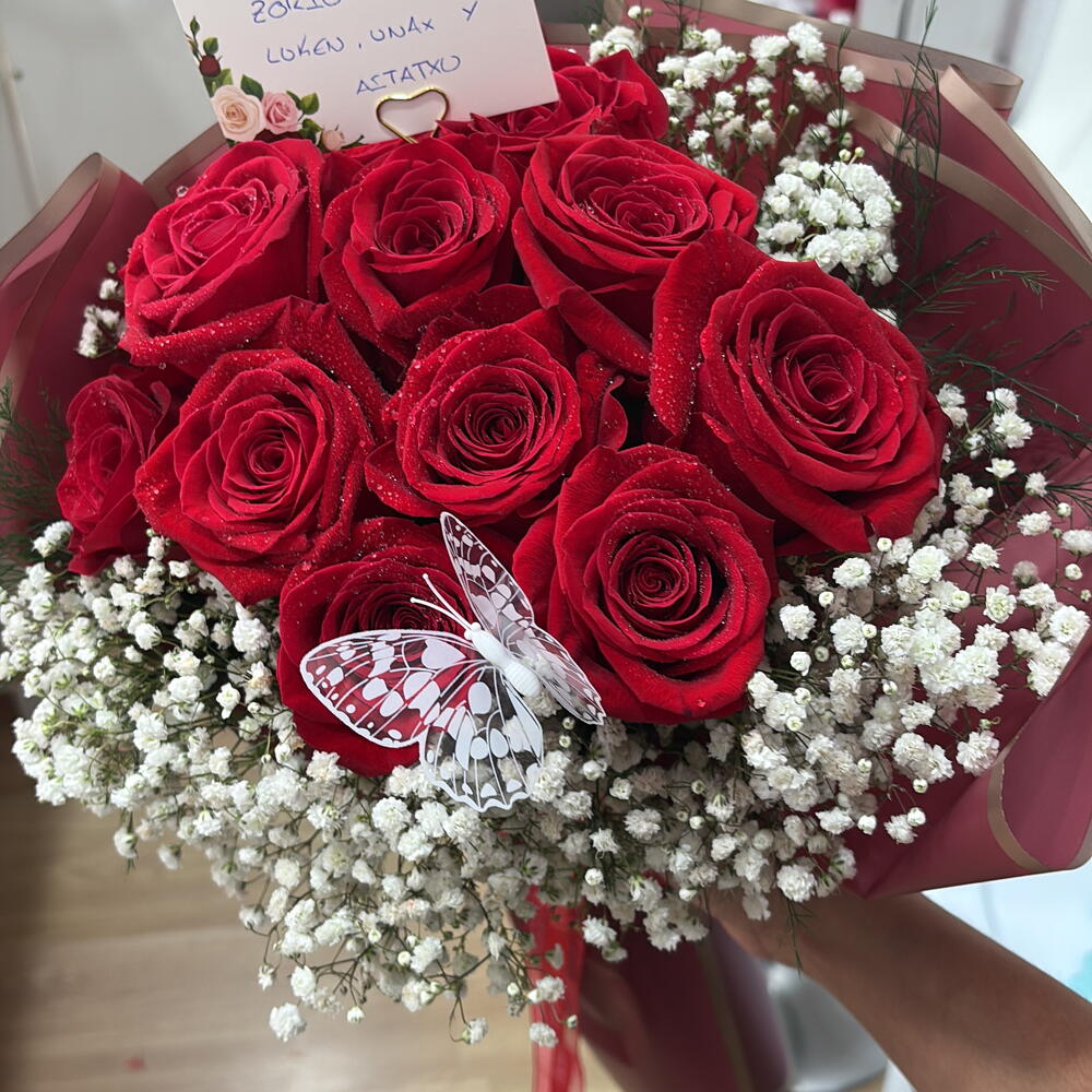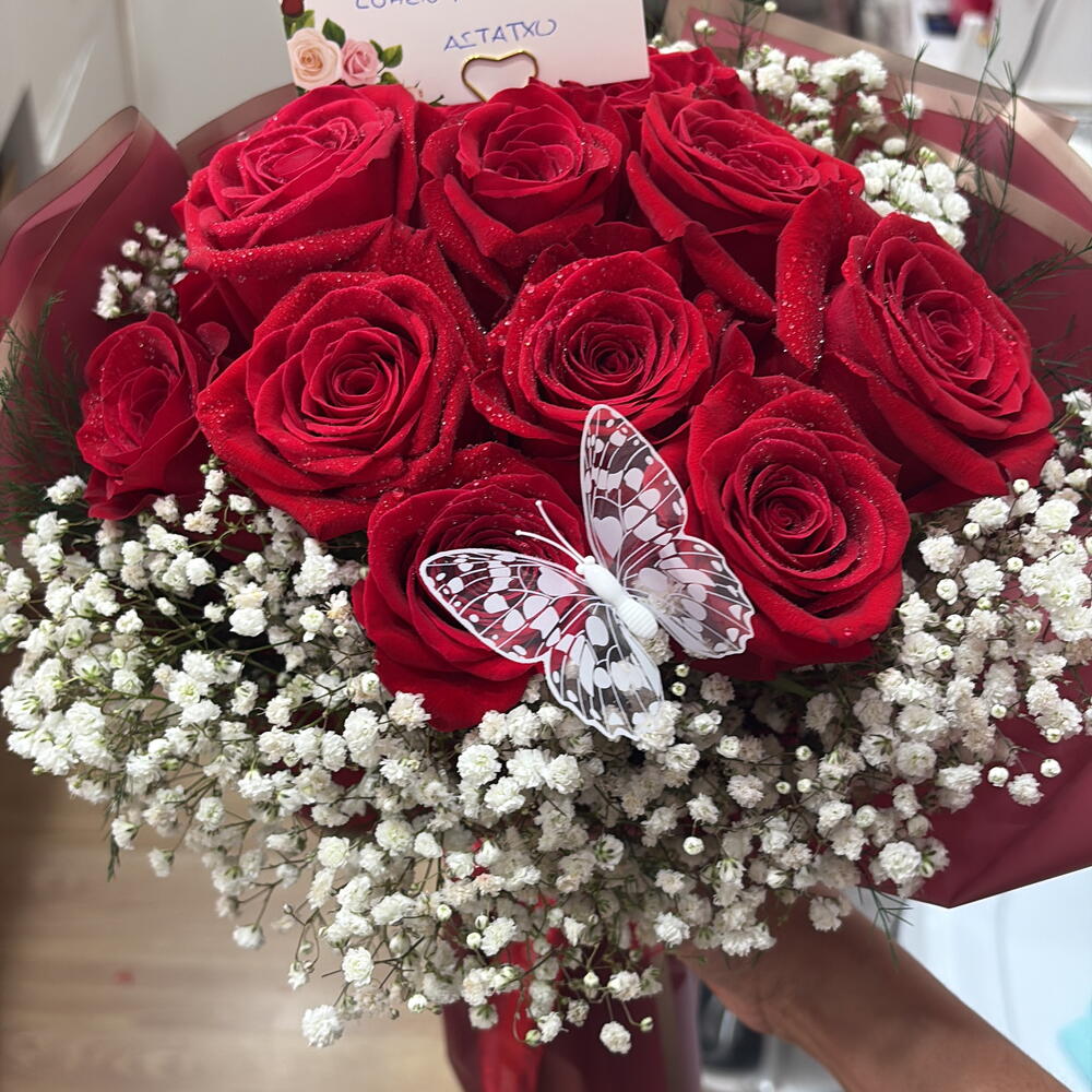 gypsofilia - 6 pcs decorative butterflies - 1 pcs red Korean paper - 4 pcs red freedom rose - 12 pcs