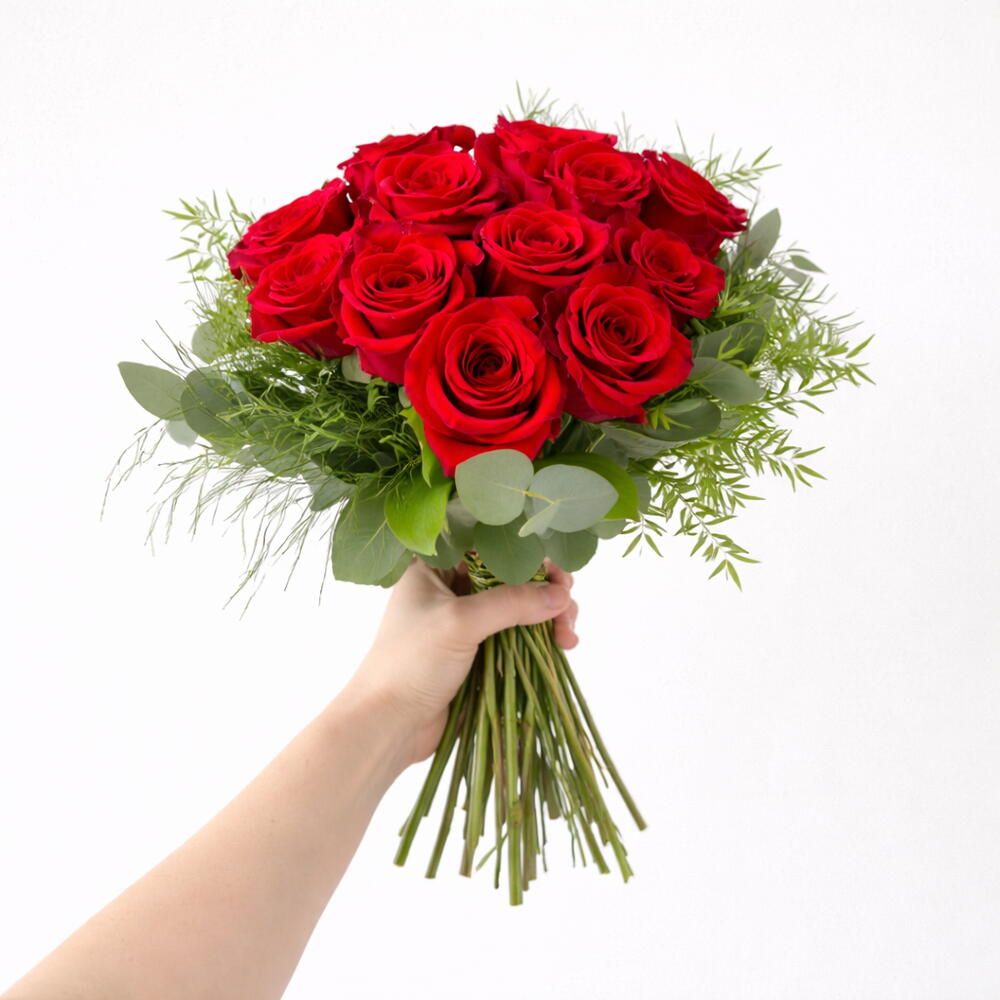 This elegant bouquet of red roses is the ideal choice to express love and admiration. The roses, accompanied by subtle eucalyptus and ruscus foliage, create a sophisticated and timeless arrangement that will delight whoever receives it. Perfect for any special occasion when words are not enough to express your feelings.