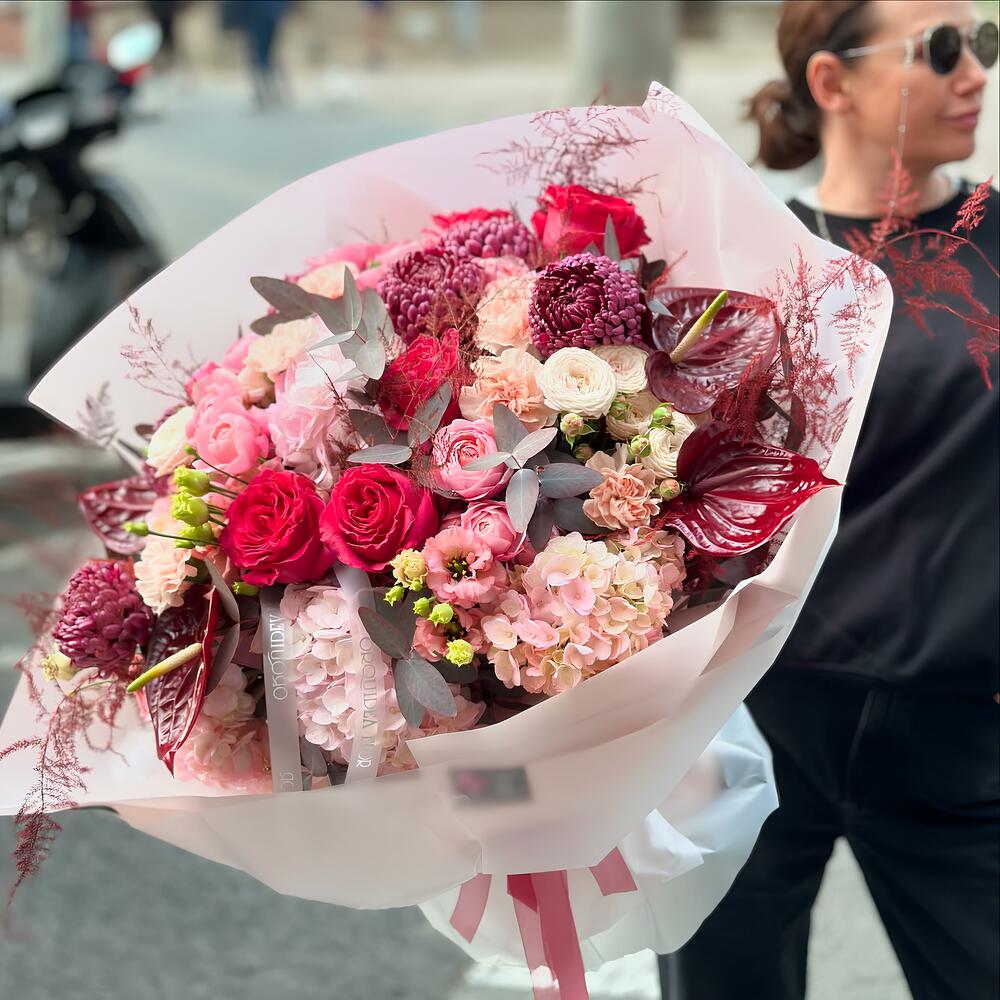 hydrangea - 3 pcs eucalyptus - 5 pcs pink - 10 pcs crisantemo - 4 pcs clavel - 4 pcs anthurium - 4 pcs decorative red fern - 3 pcs