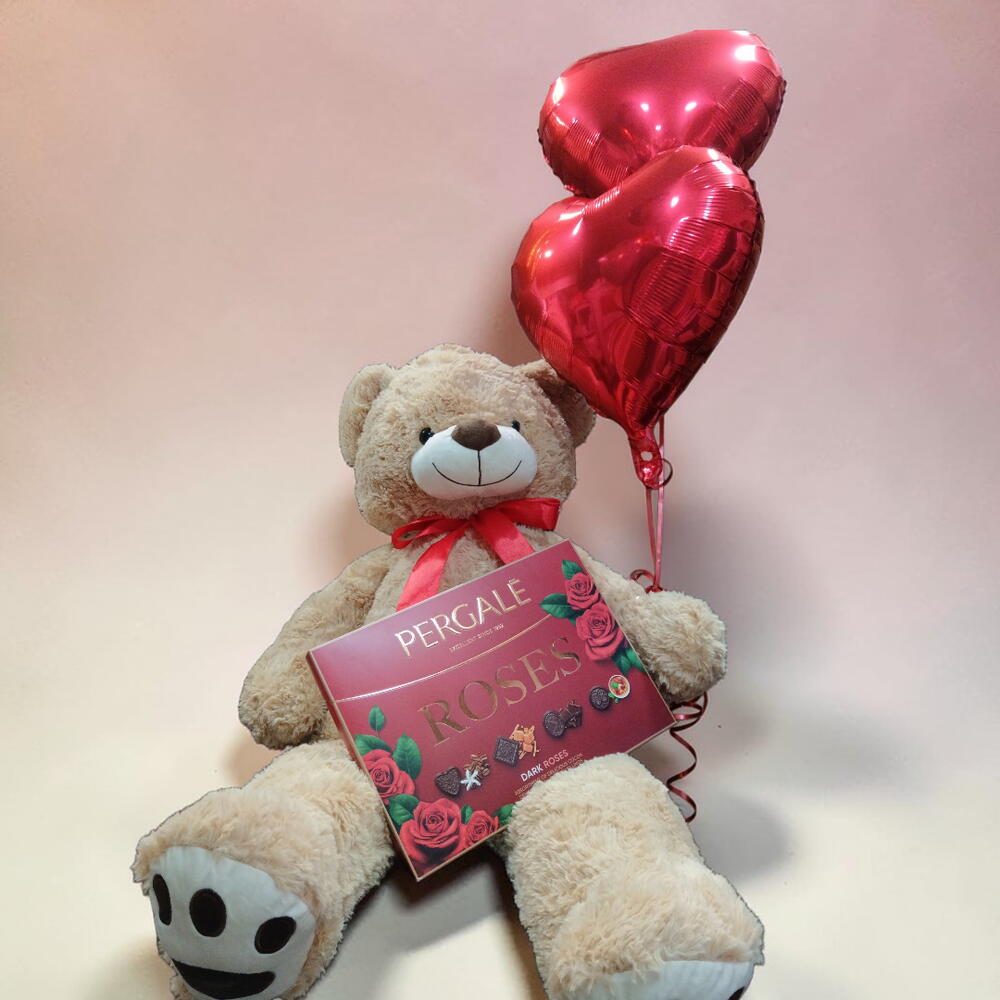 Fleece plush teddy bear 100 cm colors subject to availability 18-inch helium balloons Black box of chocolates