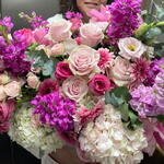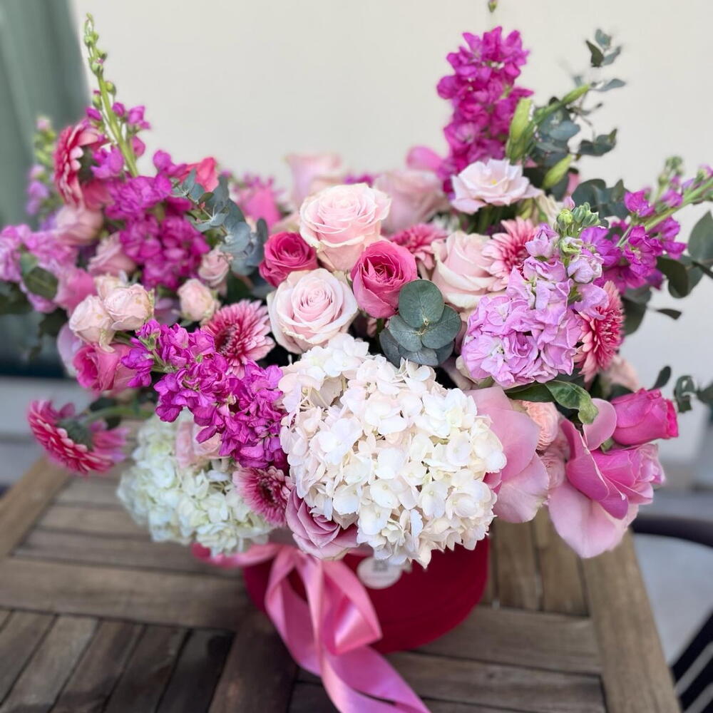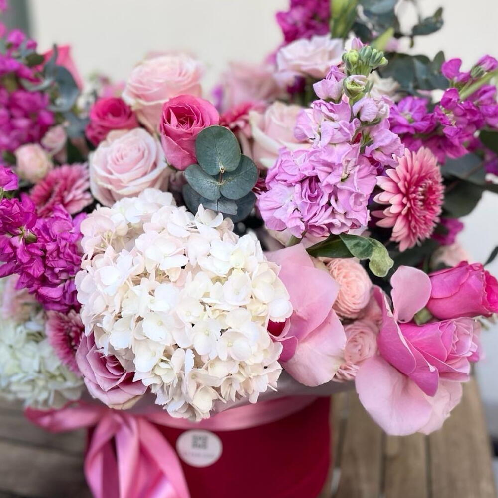 hydrangea - 5 pcs Oasis - 2 pcs germini - 10 pcs rose pink floyd - 10 pcs mathiola - 10 pcs hat box - 1 pcs eucalyptus leaves - 10 pcs world rose - 10 pcs The text "liziantuz" does not appear to be a valid word or phrase in any language, and it seems to be a typographical error or a misspelling. If it is intended to refer to "lisianthus," a type of flower, the translation would be: lisianthus - 10 pcs spray roses - 5 pcs