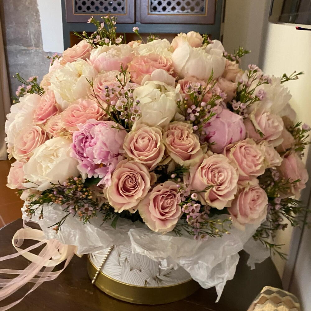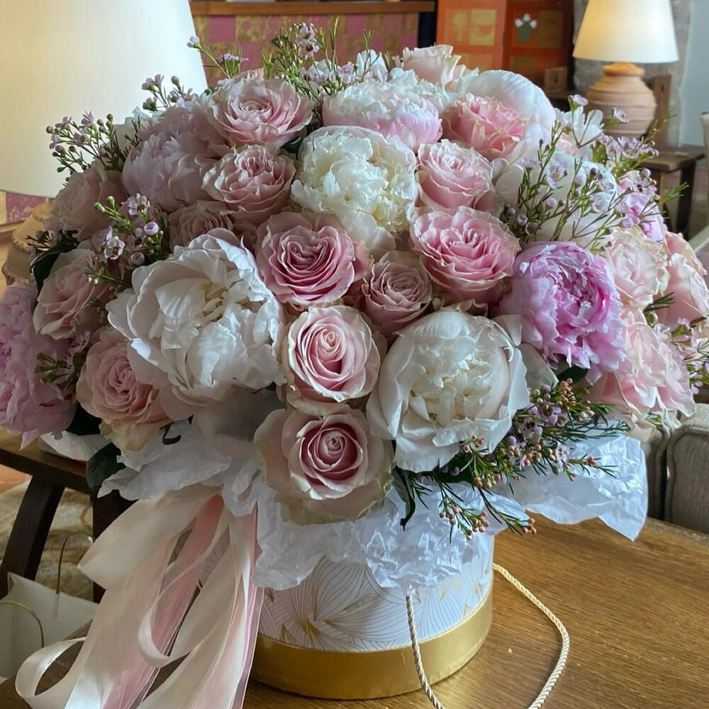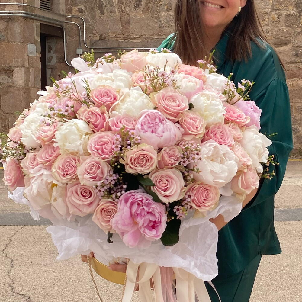 Box - 1 pcs Oasis - 2 pcs Peony - 30 pcs rose - 50 pcs flax - 10 pcs