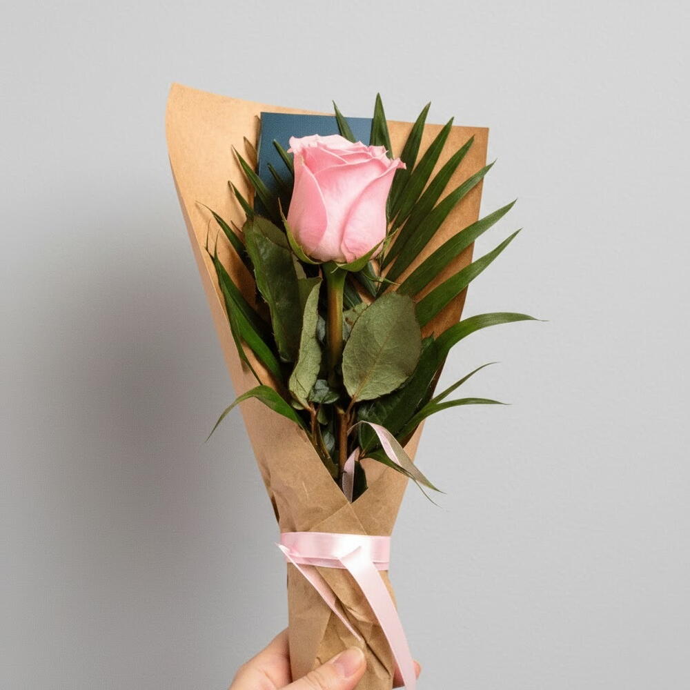 This delicate single pink rose bouquet is a symbol of tenderness, admiration, and heartfelt emotions. The soft blush rose is beautifully framed with fresh green foliage, creating a simple yet elegant composition. Wrapped in natural kraft paper and finished with a pale pink ribbon, it looks modern, stylish, and sincere. This bouquet is perfect for a romantic gesture, a first date, a small celebration, or just to say “I’m thinking of you.” The minimalist design highlights the beauty of the rose itself and makes the gift feel personal and meaningful. To keep the flower fresh for as long as possible, place it in clean water, trim the stem regularly, and keep it away from direct sunlight and heat sources.