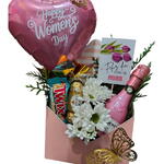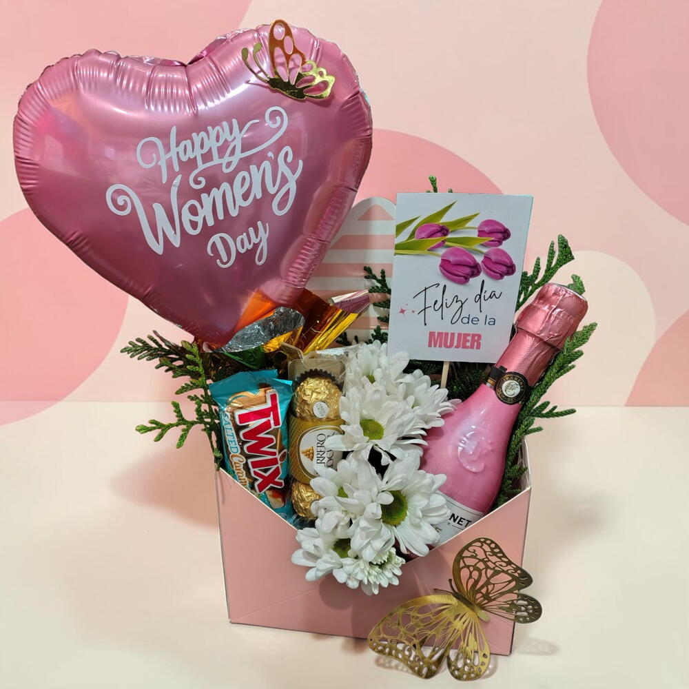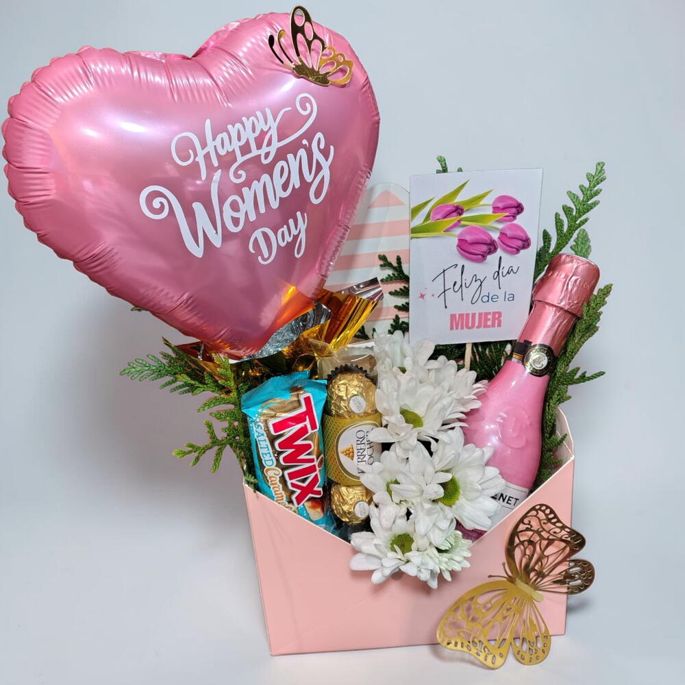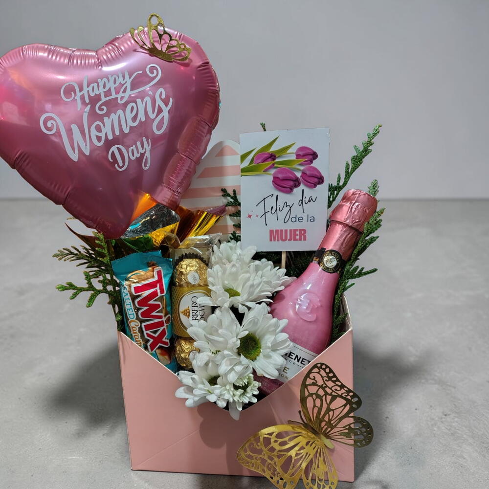 This charming flower basket is the perfect gift for any occasion. It comes carefully arranged in a decorative, envelope-shaped box that includes an exquisite bow, a 10-inch balloon to make it even more special, and three bunches of dazzling white daisies for a touch of elegance. In addition, the basket contains a package of delicious Ferrero Rocher chocolates and a Salted Caramel Twix to add a sweet treat to the gift. It also comes with decorative foliage to enhance its charm and a dedication card so you can express your feelings in a personalized way.