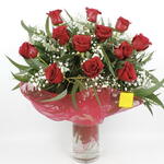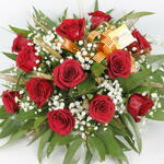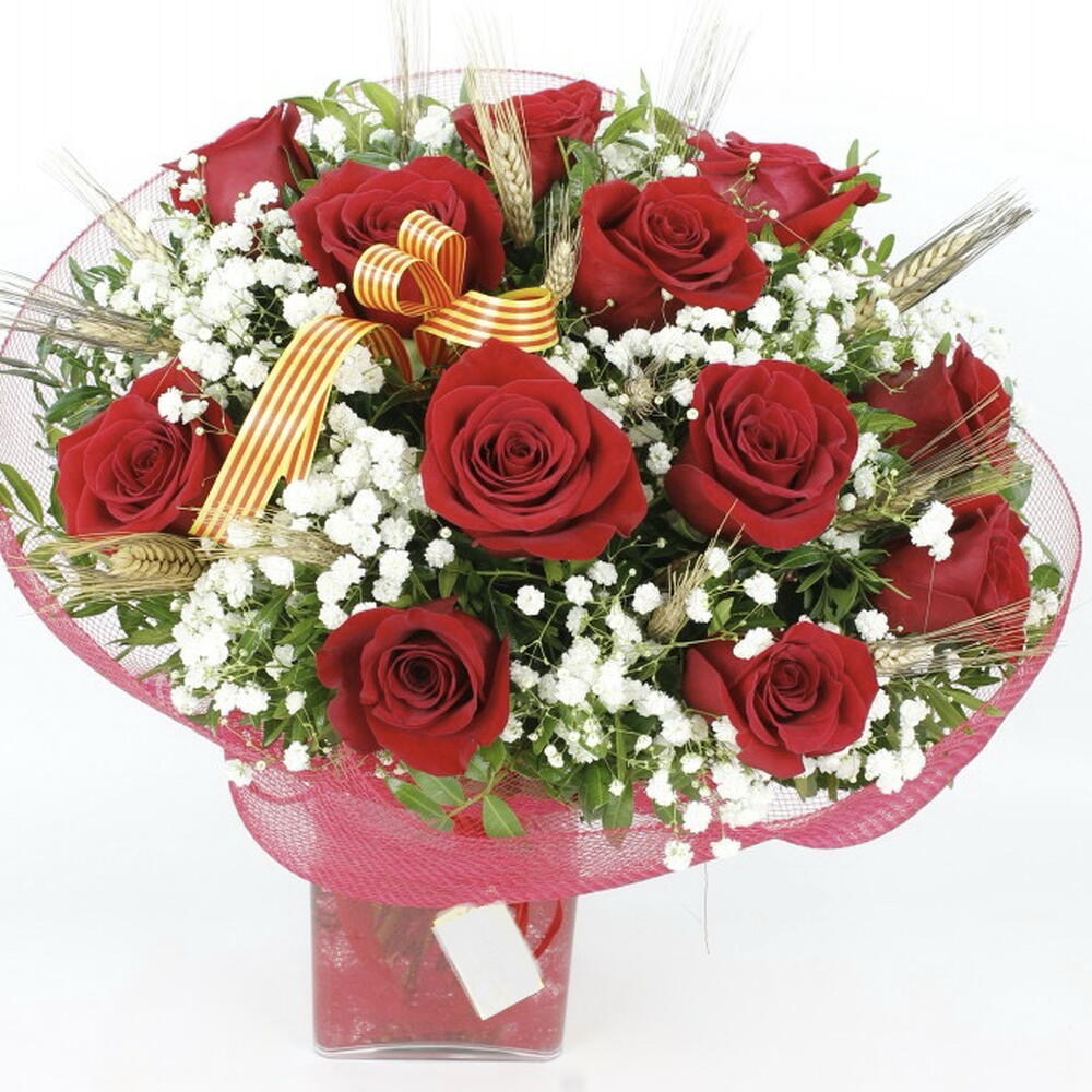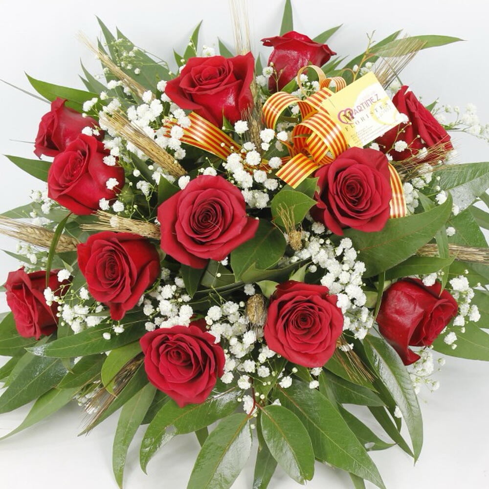 This enchanting, handcrafted rose arrangement features 12 roses harmoniously intertwined with 6 stems of wheat. The pale shimmer of 3 sprigs of baby's breath and 5 assorted greens adds a soft, natural touch. A bouquet that combines perfection and beauty, ideal for decorating any space. It's perfect for Sant Jordi's Day.
