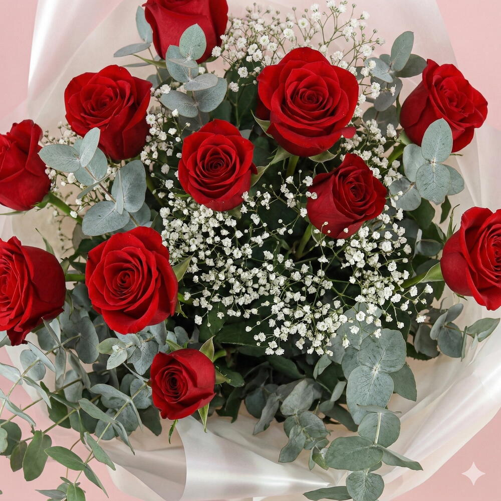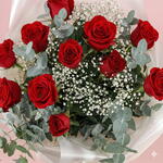 Bouquet of 12 red roses with eucalyptus and baby's breath