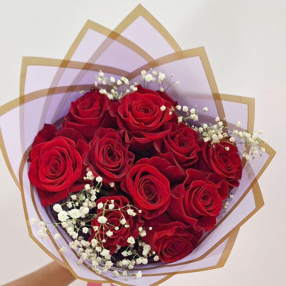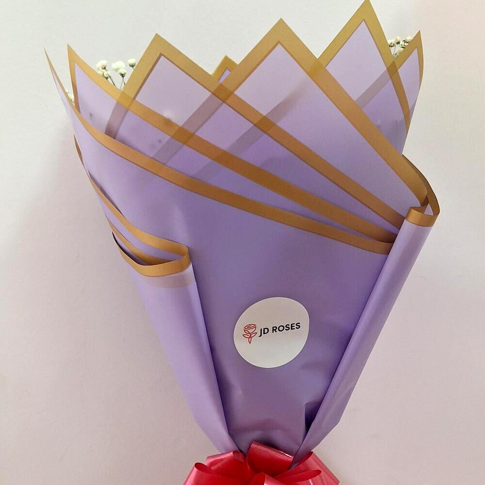 Este encantador ramo combina la intensidad de las rosas rojas con la delicadeza de la gypsophila, creando un contraste perfecto de pasión y ternura. Envuelto en un papel lila decorado con bordes dorados, este diseño irradia sofisticación y estilo. Ideal para expresar amor, gratitud o celebrar momentos especiales, este ramo será el regalo que deje una impresión duradera. Un toque de romanticismo y elegancia para cualquier ocasión. Ramo de 18 rosas rojas premium con paniculata y lazo. Ramo de rosas rojas ideal para regalar en cualquier ocasión. Un regalo clásico que nunca pasa de moda. Rosas de cultivo propio y sostenible.
