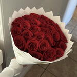 Hermoso ramo de 25 rosas rojas envuelto en papel blanco, ideal para regalar en cualquier ocasión.