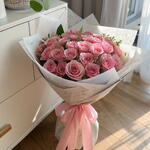 Elegant, voluminous bouquet of pink roses carefully arranged in a round, harmonious composition, ideal as a gift bouquet and flowers for women. The roses create a romantic and sophisticated feeling, perfect as a birthday bouquet, exclusive bouquet, or romantic floral arrangement. The assorted greenery adds freshness and natural balance, while the modern wrapping paper and decorative ribbon in a pink tone enhance the refined style of the composition. An outstanding option for special occasions and modern floral decoration that conveys tenderness, luxury, and delicacy.