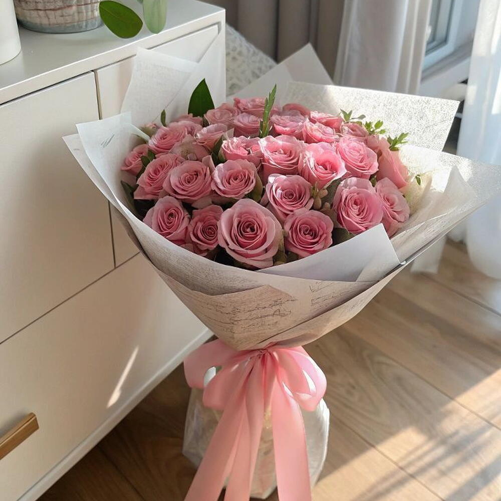 Elegant, voluminous bouquet of pink roses carefully arranged in a round, harmonious composition, ideal as a gift bouquet and flowers for women. The roses create a romantic and sophisticated feeling, perfect as a birthday bouquet, exclusive bouquet, or romantic floral arrangement. The assorted greenery adds freshness and natural balance, while the modern wrapping paper and decorative ribbon in a pink tone enhance the refined style of the composition. An outstanding option for special occasions and modern floral decoration that conveys tenderness, luxury, and delicacy.