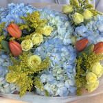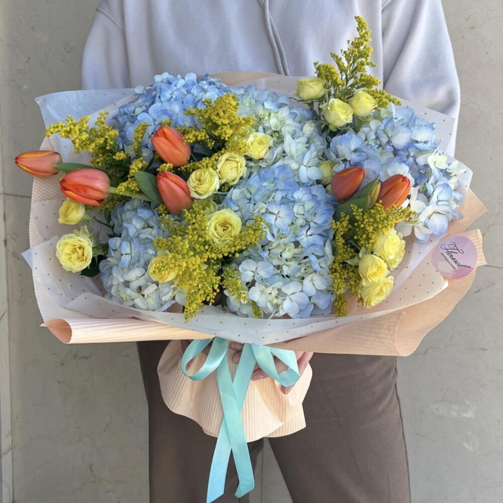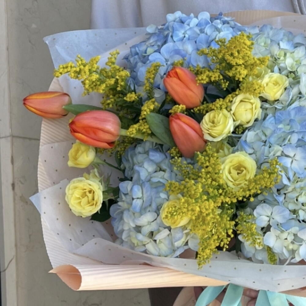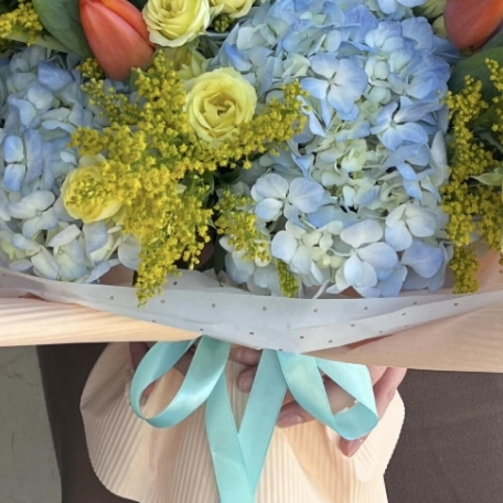 Tulips - 6 pcs Solidago - 5 pcs hydrangea - 6 pcs pink - 7 pcs