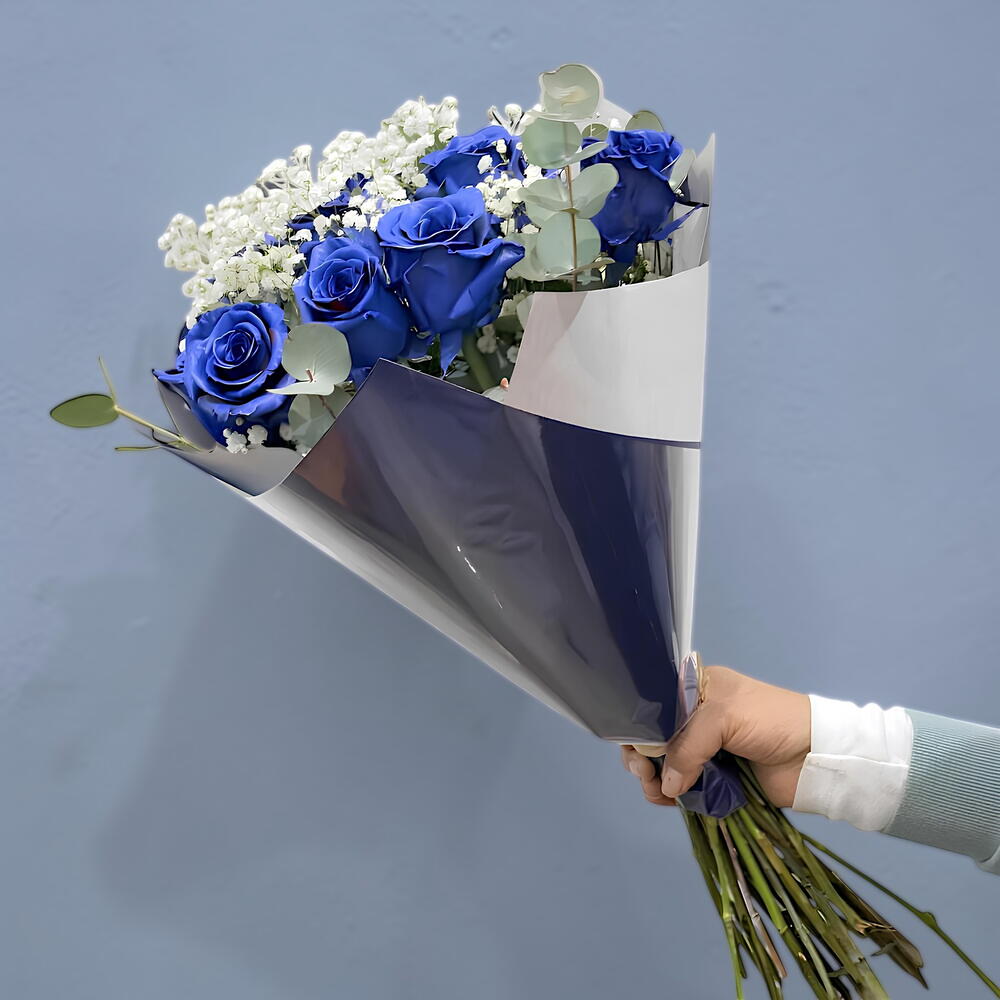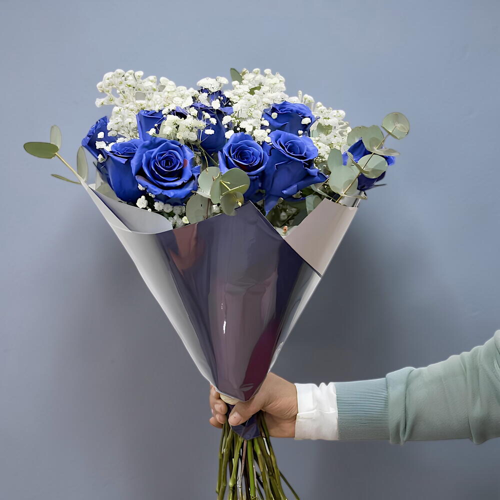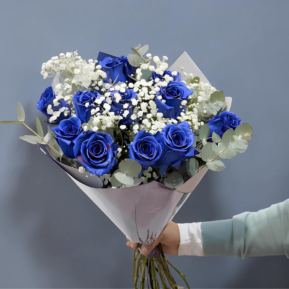 eucalipto cinerea - 4 pcs paniculata blanca - 3 pcs roses painted blue - 12 pcs