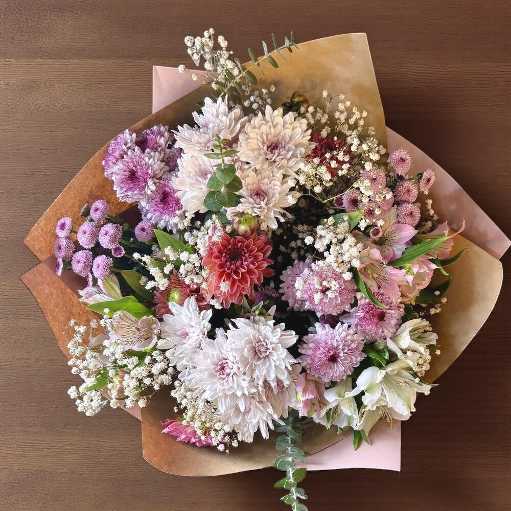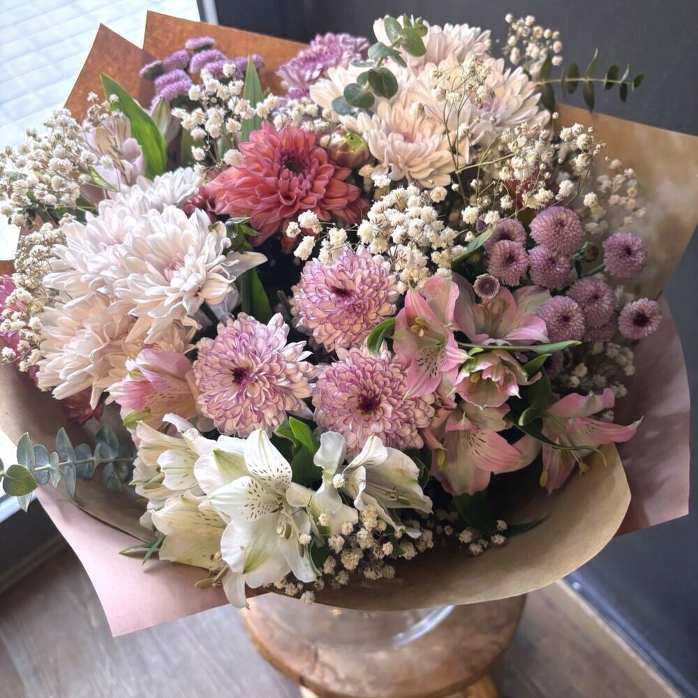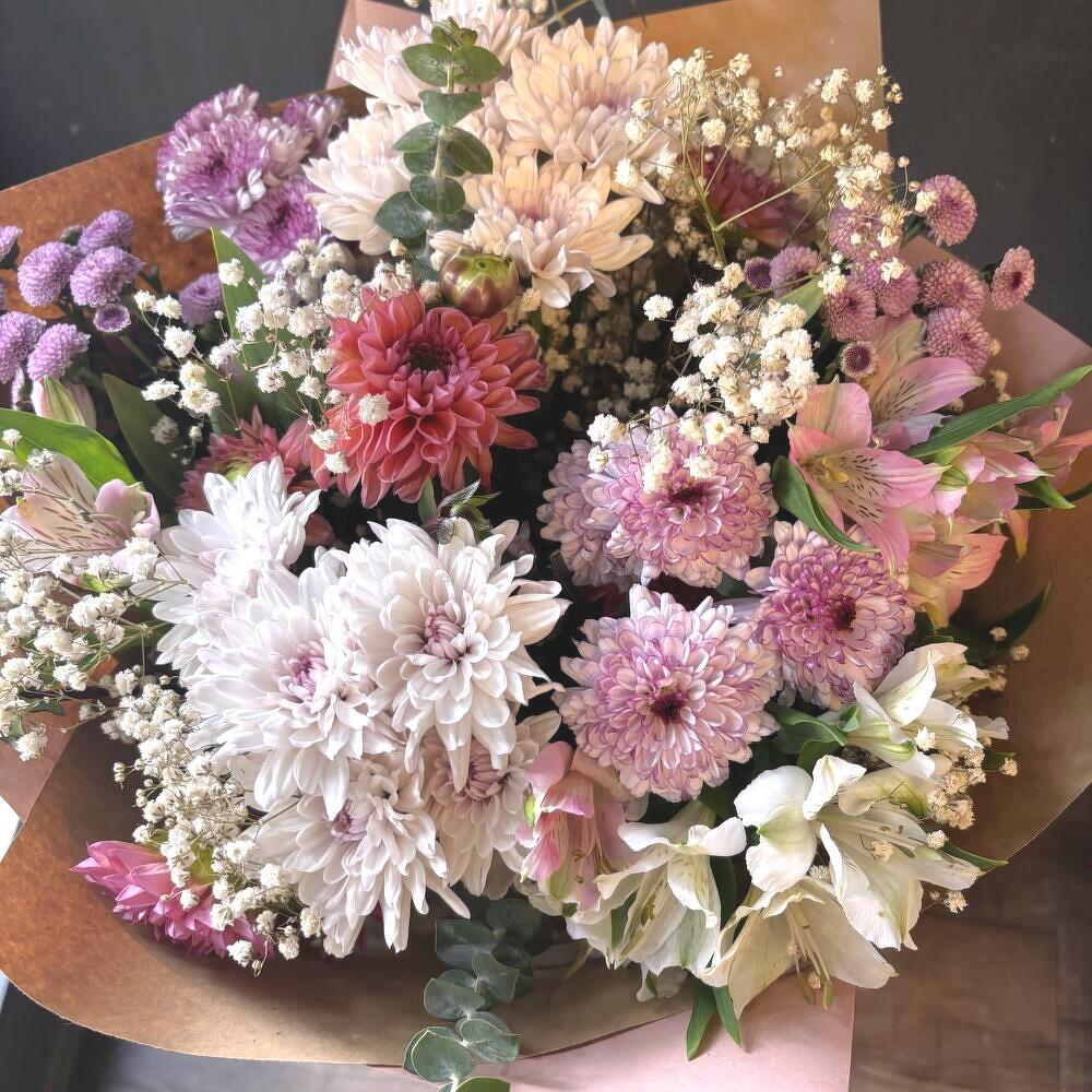 A delicate, romantic bouquet in soft pink, white and lilac tones that brings elegance and freshness to any space. Its mix of flowers creates a perfect visual harmony to celebrate birthdays, anniversaries or simply brighten the day. Place it in a vase with fresh water, trim the stems a little every two days, and avoid direct sunlight to prolong its beauty.