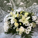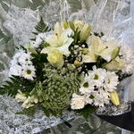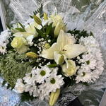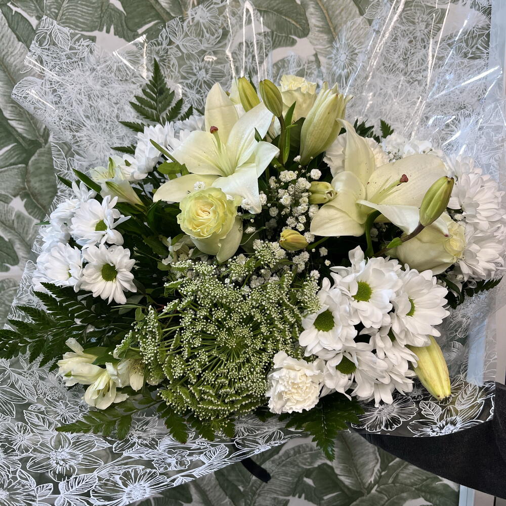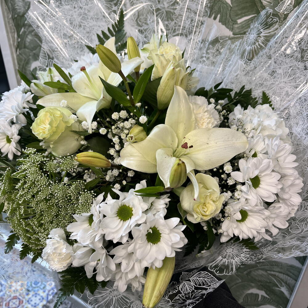 This elegant white bouquet conveys purity, serenity and sophistication through a carefully composed combination of classic flowers. White lilies provide prominence and elegance, while roses and carnations reinforce the arrangement's delicate, romantic character. White chrysanthemums create volume and a harmonious structure, accompanied by gypsophila that adds lightness and an ethereal finish. Various greens balance the composition and bring natural freshness. Wrapped in fine decorative paper, this gift bouquet is ideal as flowers for a woman, an elegant bouquet, a romantic floral arrangement, or flowers for a special occasion. Its clean, refined aesthetic makes it an exclusive bouquet and a perfect choice for modern floral decor and meaningful events.