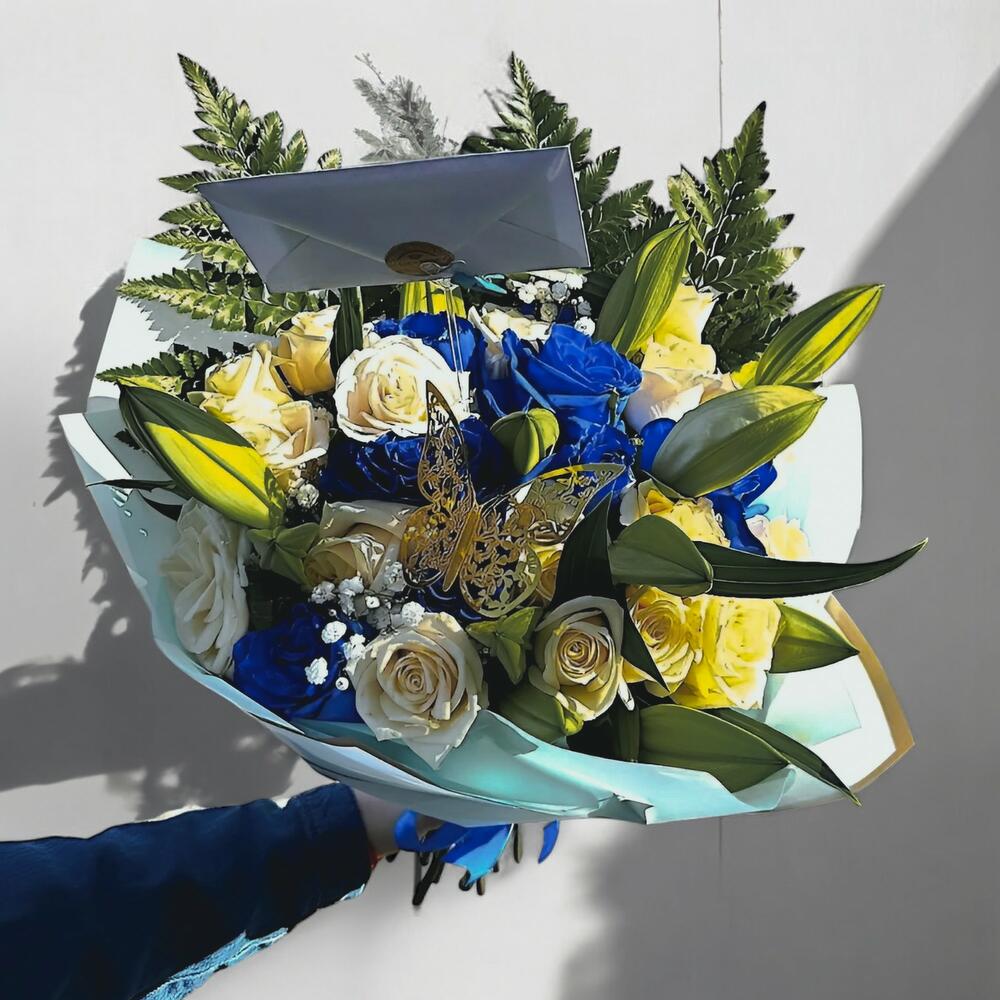 This Blue Moon bouquet is a true display of elegance and freshness. With a harmonious blend of lilies, white roses and blue roses, baby's breath (paniculata) and leather fern add a sense of lightness and naturalness. Ideal for any special occasion, this bouquet expresses feelings of love, serenity and sophistication. The special touch of the golden butterfly on the bouquet gives it a unique and charming finish. Care recommendations To maintain the freshness of this bouquet, place it in a vase with clean water and change the water every two days. Flowers stay fresh longer if you keep them away from direct sunlight and heat sources. Roses will enjoy a cool, well-ventilated environment, ensuring their beauty is preserved for longer.