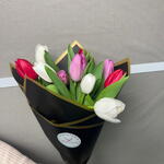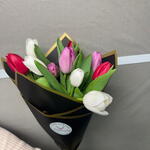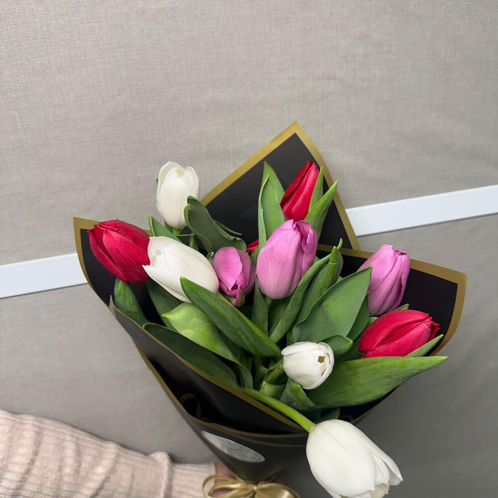 This classic bouquet consists of a beautiful combination of white tulips (4 stems), red tulips (3 stems) and pink tulips (3 stems). The perfect blend of vivid and soft colors will provide a touch of elegance and sophistication to any setting. It's the perfect gift to express love, gratitude, or simply to brighten someone's day.