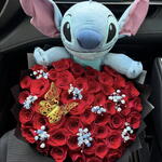 This charming bouquet combines the passion and elegance of fresh red roses with the tenderness of an adorable Stitch plush. Perfect for expressing love, affection, or surprising someone special with a romantic and fun detail that will remain in their memory.