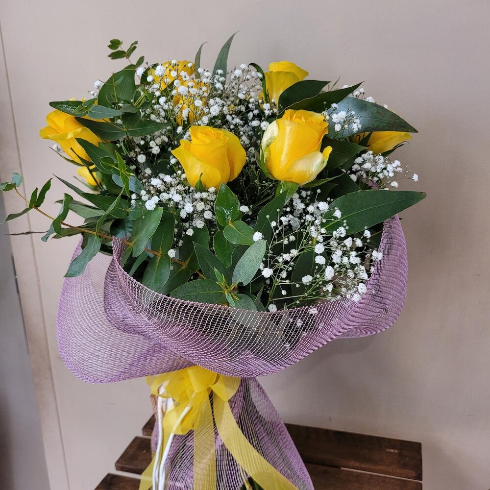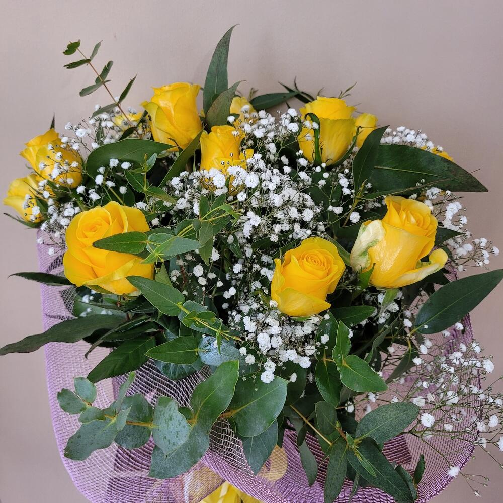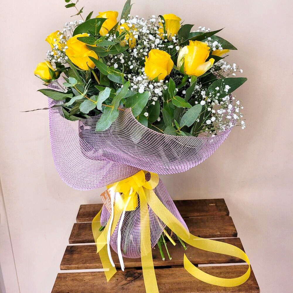 A bouquet full of joy and light, composed of elegant yellow roses that symbolize friendship and happiness, complemented by delicate white flowers and fresh green foliage. Wrapped in a soft lilac mesh with a bright yellow ribbon, this design stands out for its freshness and vitality. Perfect for celebrating happy moments, expressing gratitude, or simply brightening someone's day. A gift that conveys positive energy and warm emotions in every detail! Beautiful bouquet of yellow roses, a composition full of color and symbolism, for special occasions when declaring many feelings.