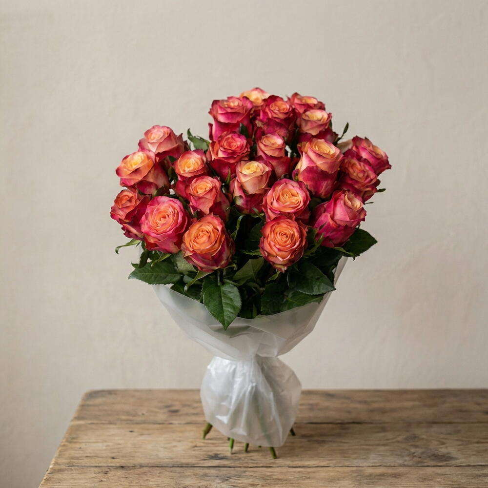 La rosa Mai Tai destaca por su apertura elegante y sus pétalos con degradados intensos, creando un efecto visual dinámico y sofisticado. El diseño del ramo resalta la fuerza del color y la frescura natural de cada flor, logrando una composición equilibrada y llena de personalidad.
