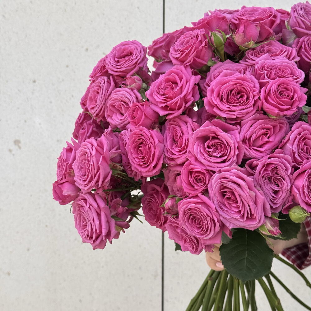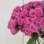 An exuberant bouquet of fuchsia roses that conveys passion and elegance in every detail. Its compact, harmonious shape creates an intense and sophisticated visual impact. Ideal for expressing strong feelings with a modern, refined touch.
