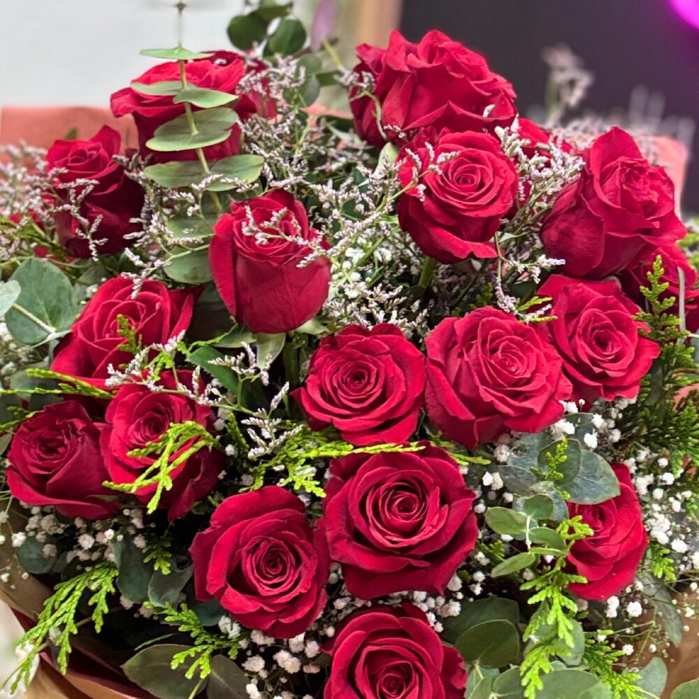 Ramo de 25 rosas rojas naturales con verdes y toque blanco