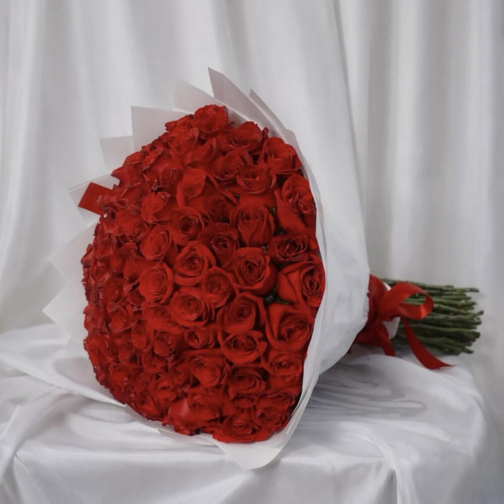 Bouquet of 50 roses wrapped in white paper