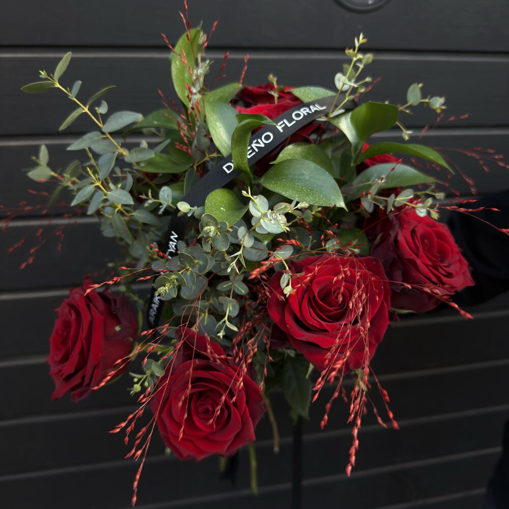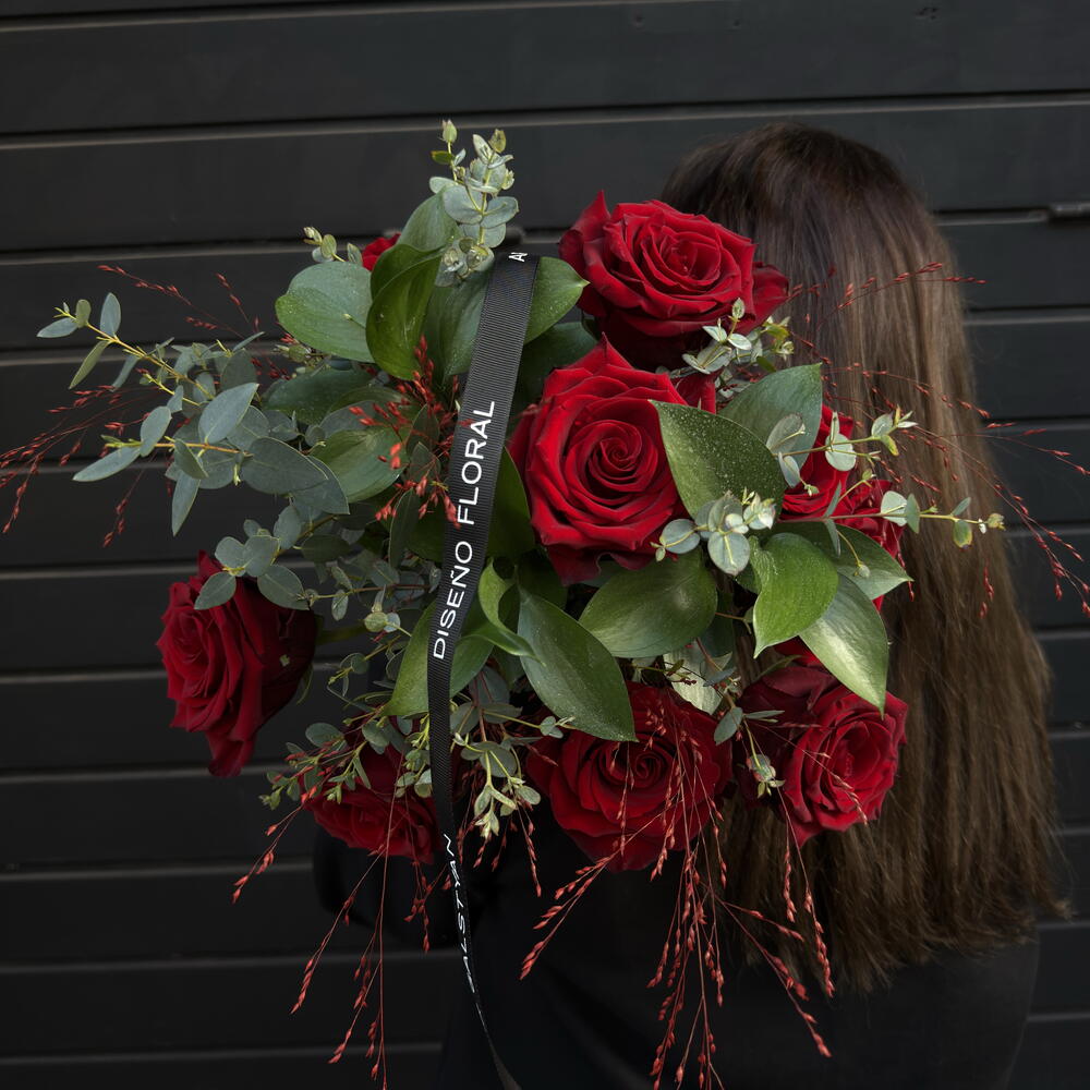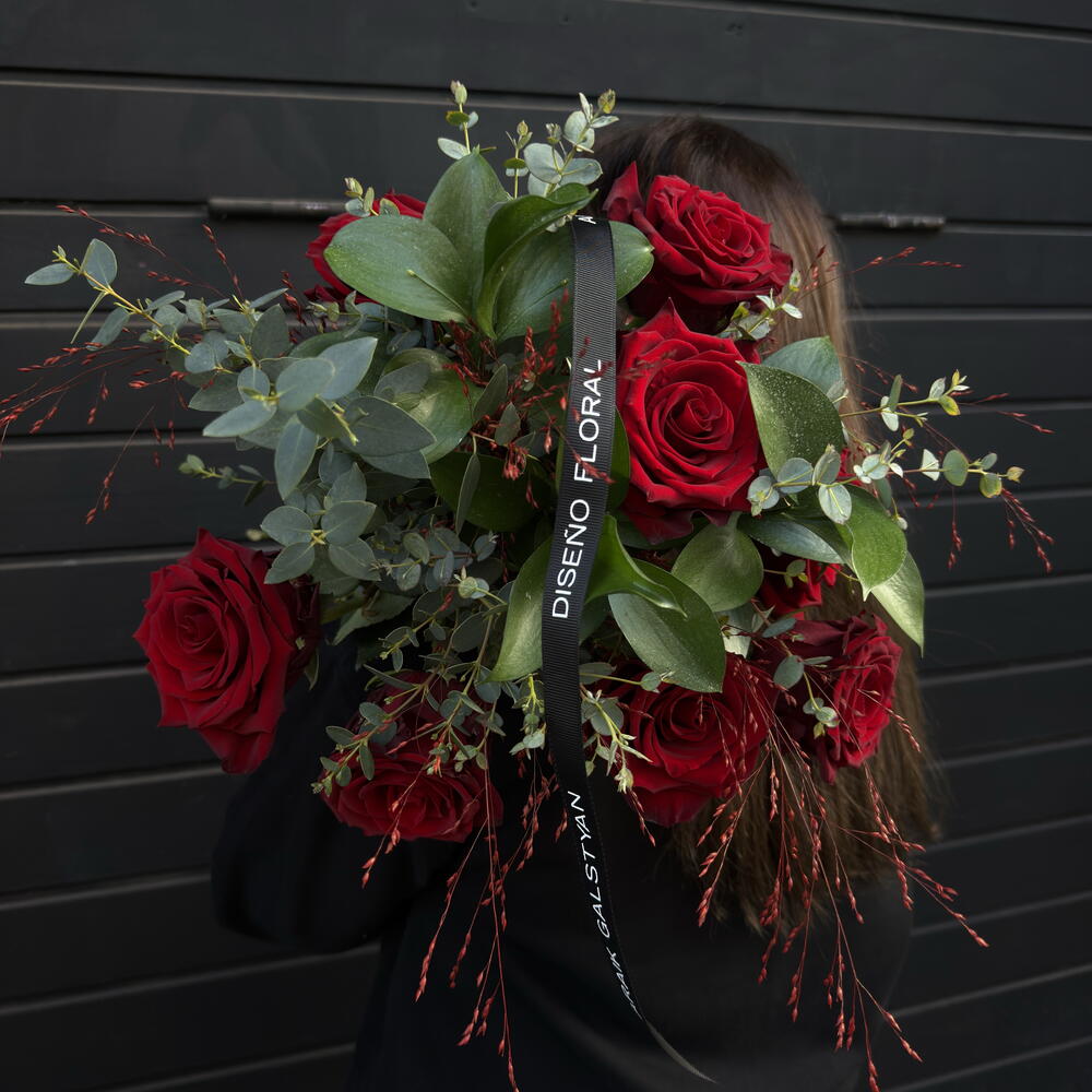 Bouquet of 9 deep red roses with fresh eucalyptus. A classic combination that conveys love, passion and elegance. Ideal for Valentine's Day, anniversaries or a romantic gesture. Careful presentation and timeless style.
