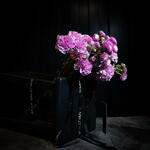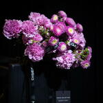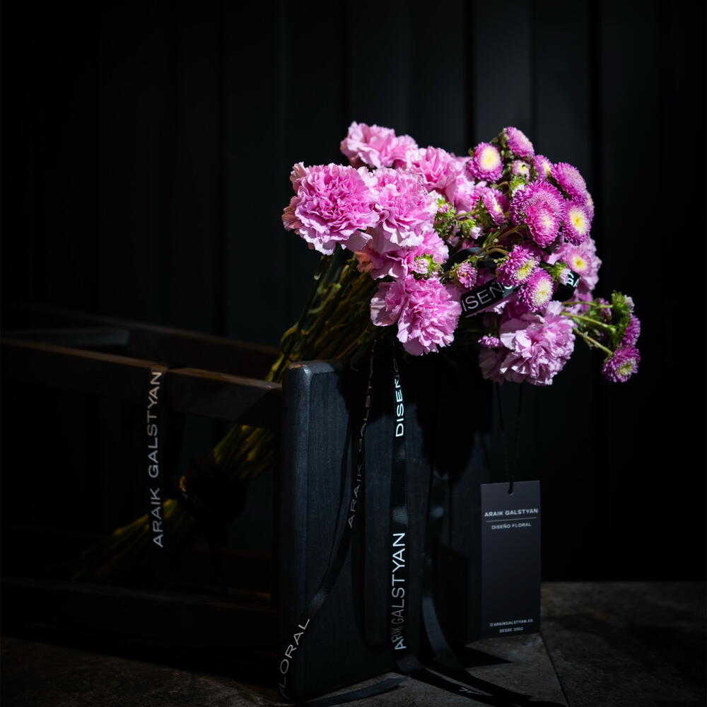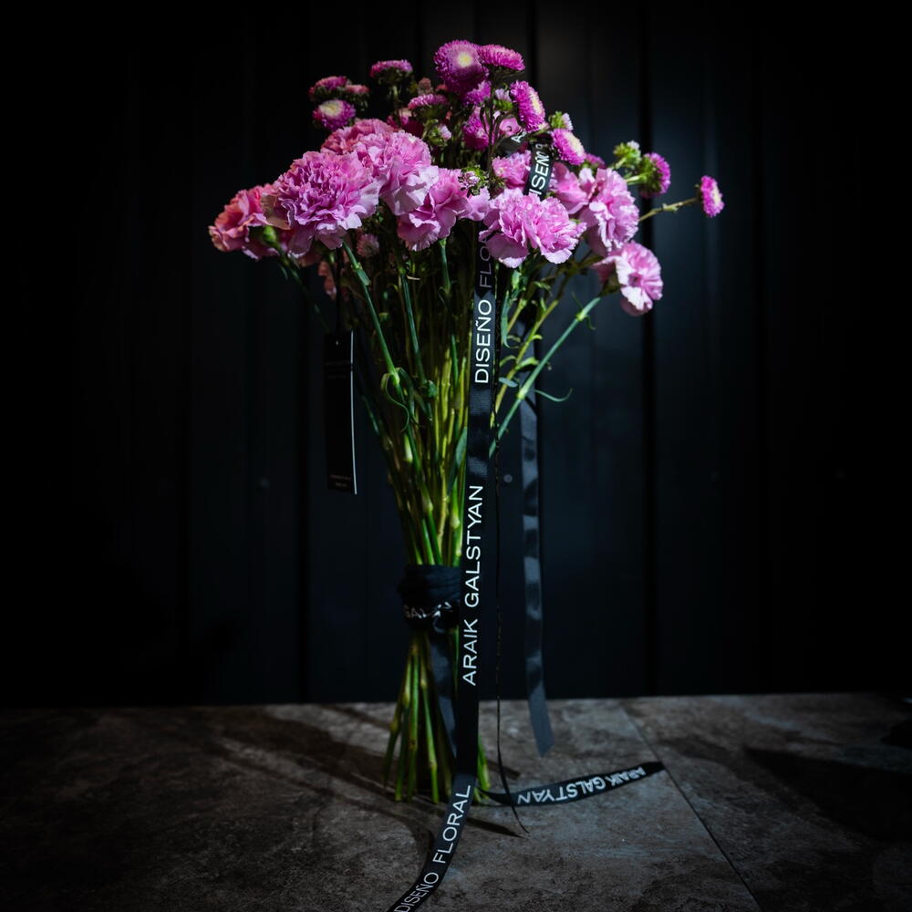 An elegant, delicate bouquet composed of pink carnations and fuchsia asters. The flowers create an airy, romantic texture, ideal for gifting on any occasion. The black ribbon with the branding adds a modern, exclusive touch.