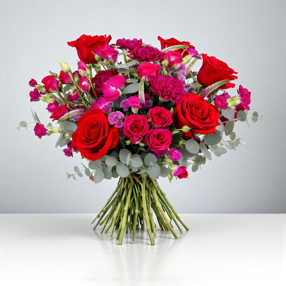 This bouquet blends intense red roses with vibrant fuchsia blossoms, creating a striking contrast that conveys passion, joy, and presence. It's romantic, yes, but also bold. It's not delicate. It's memorable. Each flower is carefully placed to create volume, movement, and an immediate "wow" factor. It's one of those bouquets that makes the recipient stare at it for a long time before saying a word. And on Valentine's Day, that's worth its weight in gold. Perfect for intense relationships, secure love, strong personalities, or when you want to show that you didn't just buy "the first thing you saw."