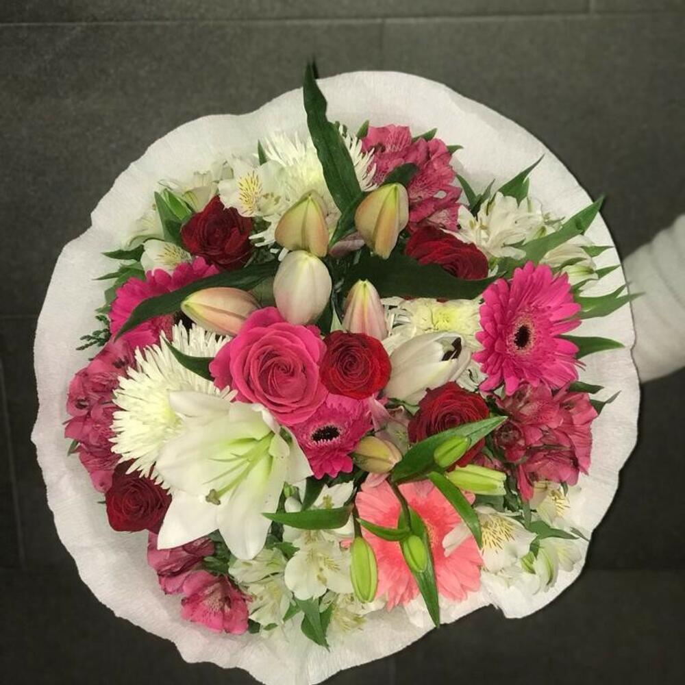Gerbera - 3 pcs Lilium - 2 pcs pink - 4 pcs anastasia - 2 pcs verdes variados - 4 pcs astromelias - 6 pcs