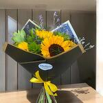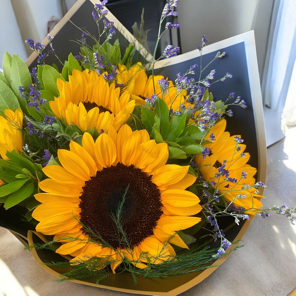 A vibrant bouquet of sunflowers that radiates happiness and positive energy. Designed with fresh green leaves and delicate touches of violet flowers, this arrangement is perfect for brightening any space or expressing your warmest feelings. Wrapped in elegant black paper with golden edges and a bright yellow ribbon, it's a gift that stands out for its style and freshness.