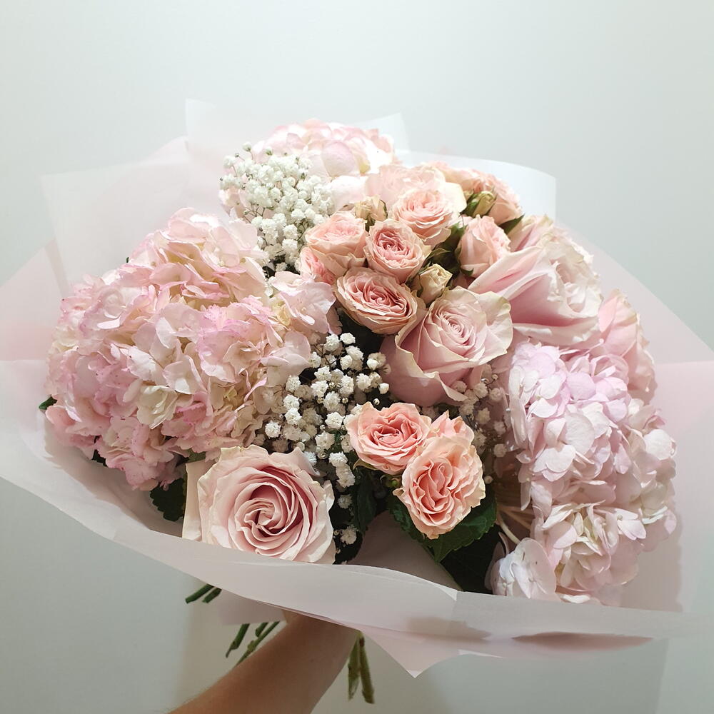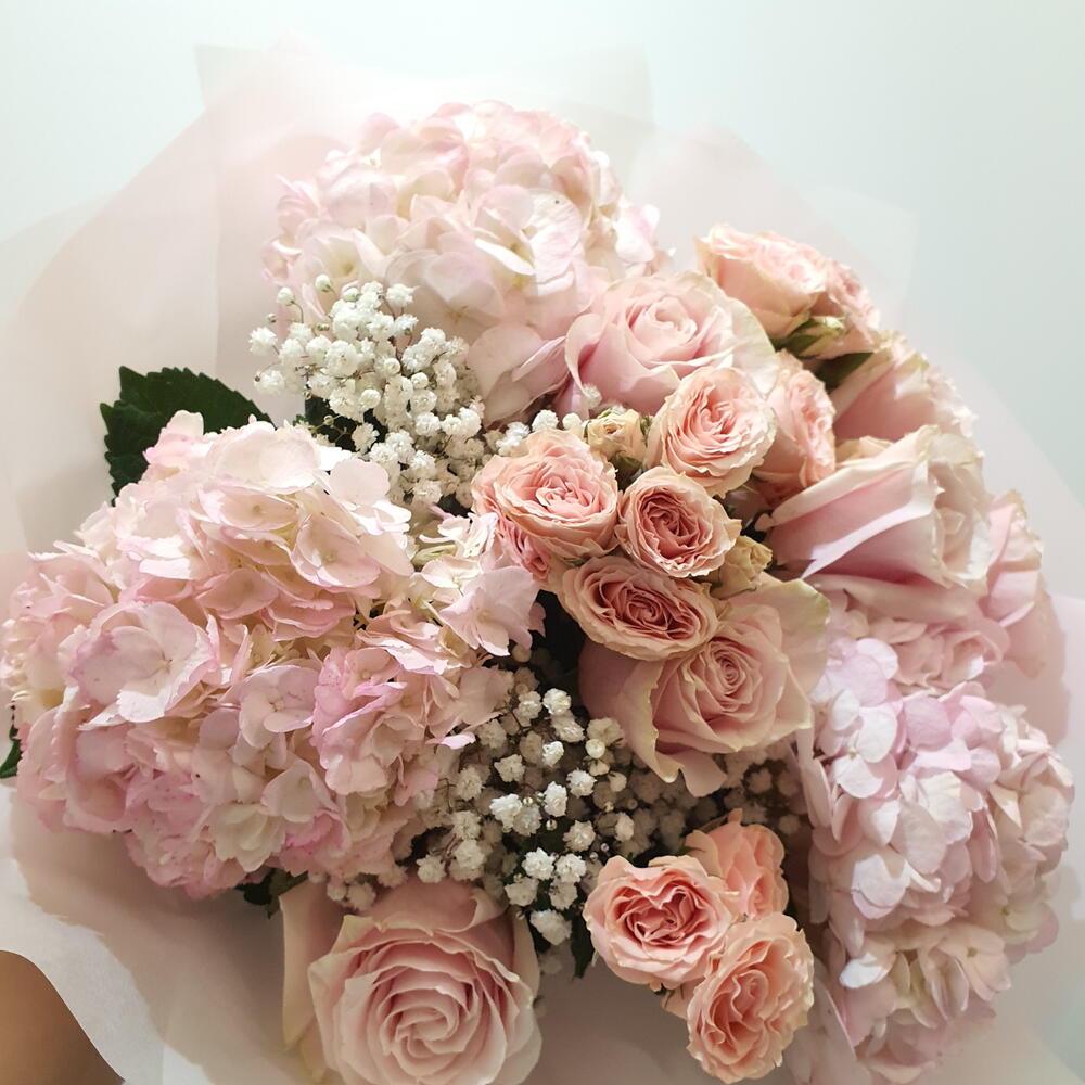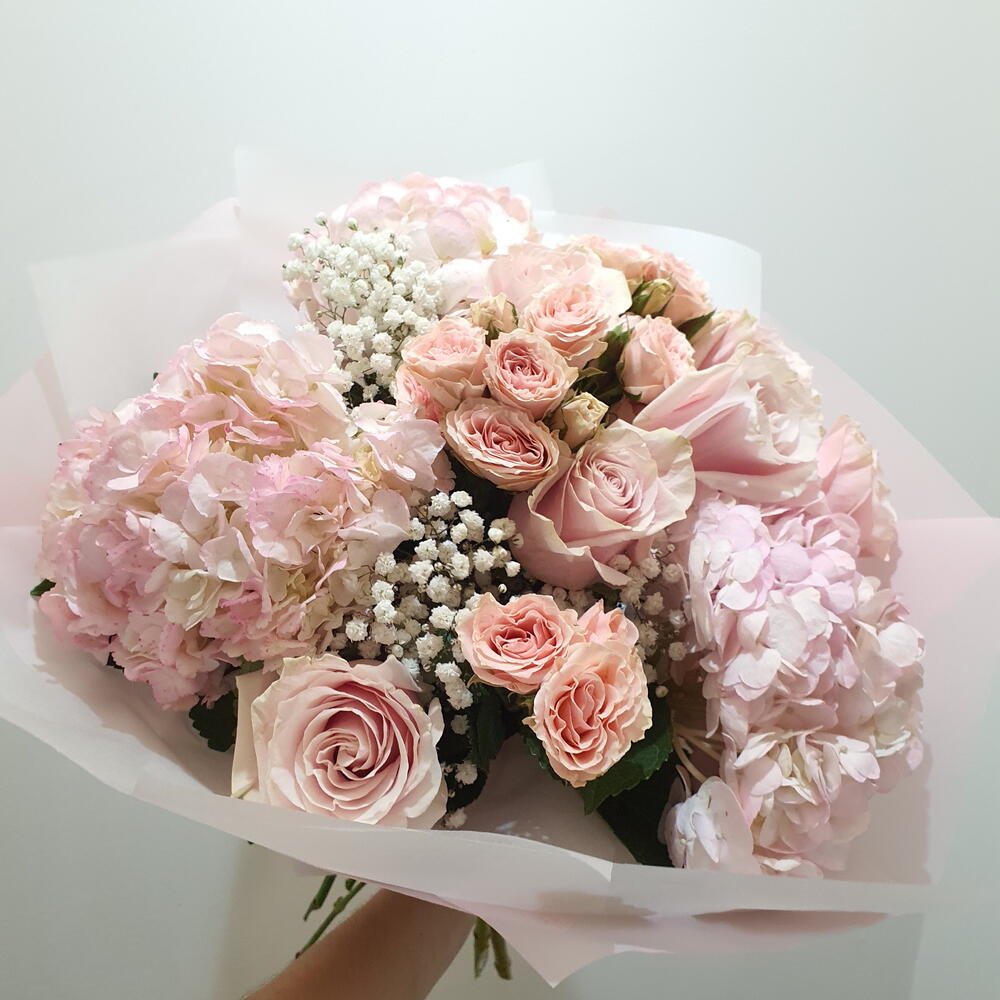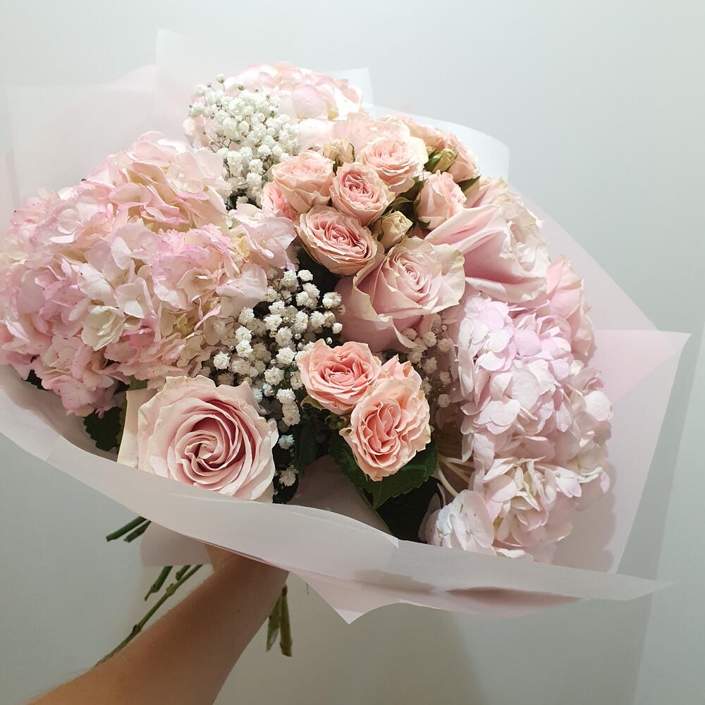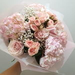 Ribbon - 1 pcs hydrangea - 3 pcs Wrapping - 1 pcs roses - 5 pcs rose spray - 5 pcs seasonal greens - 2 pcs