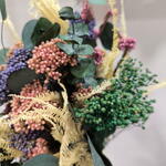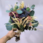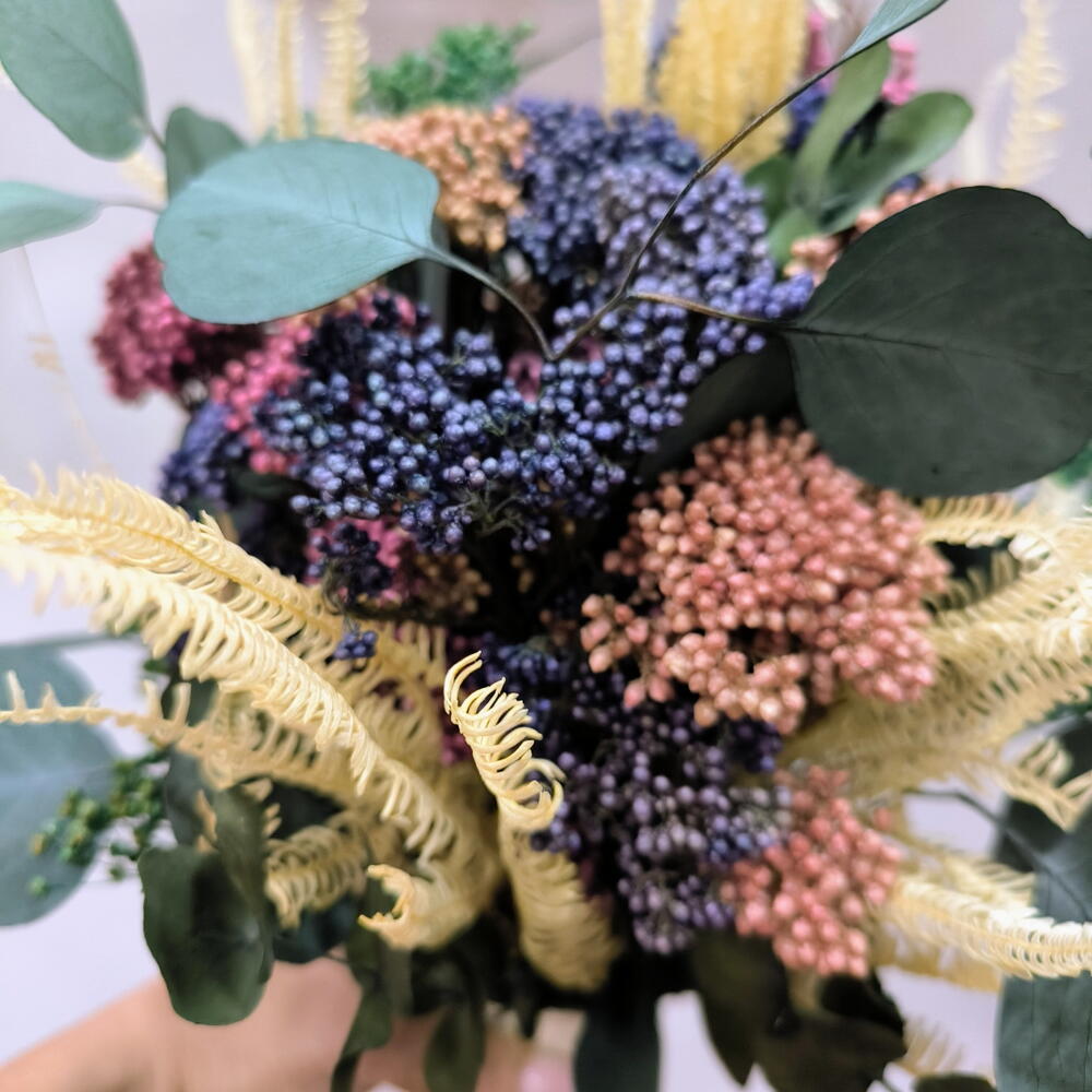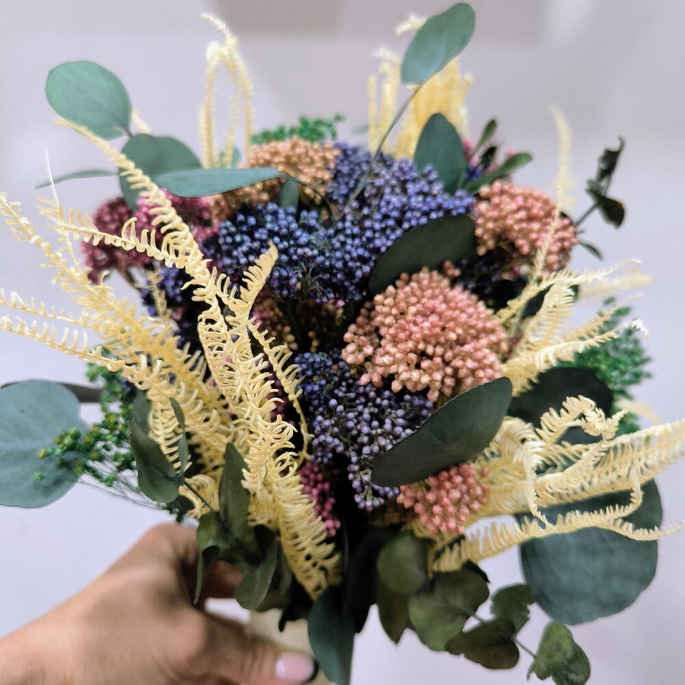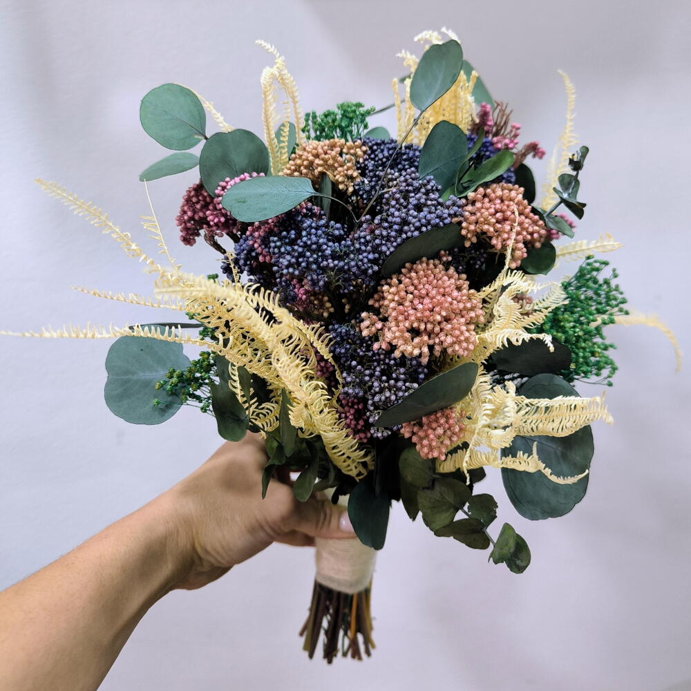 This handheld bouquet is made with preserved flowers, designed to accompany special moments without the need for maintenance. Its combination of textures and soft colors makes it a perfect piece for civil ceremonies, photo sessions, or to decorate a pretty corner at home with a natural and elegant touch. The design consists of: -Preserved rice flower in mauve, lavender and peach tones. -Preserved fern in cream color. -Preserved eucalyptus. -Small accents of preserved green broms that bring freshness and volume. Thanks to its preserved materials, this bouquet remains beautiful for years, making it a perfect gift or to accompany you on a special day.