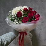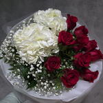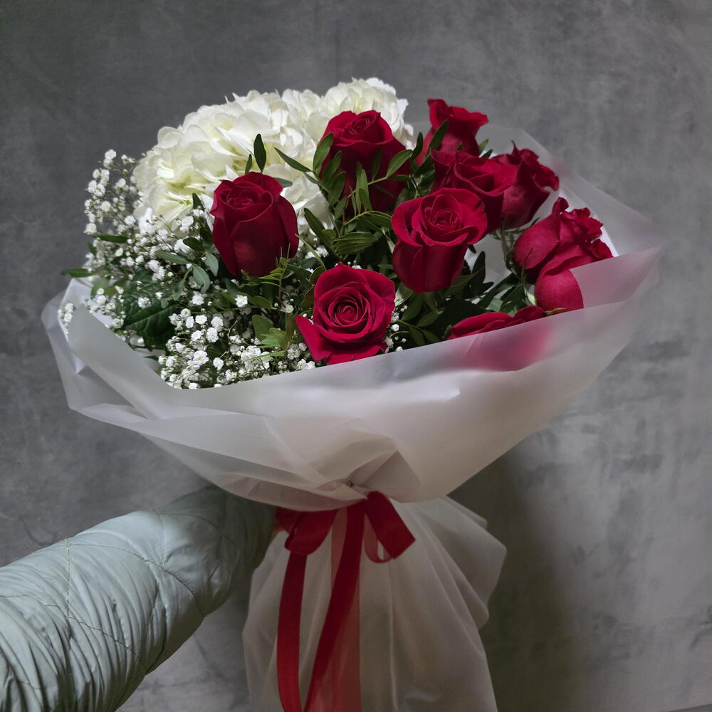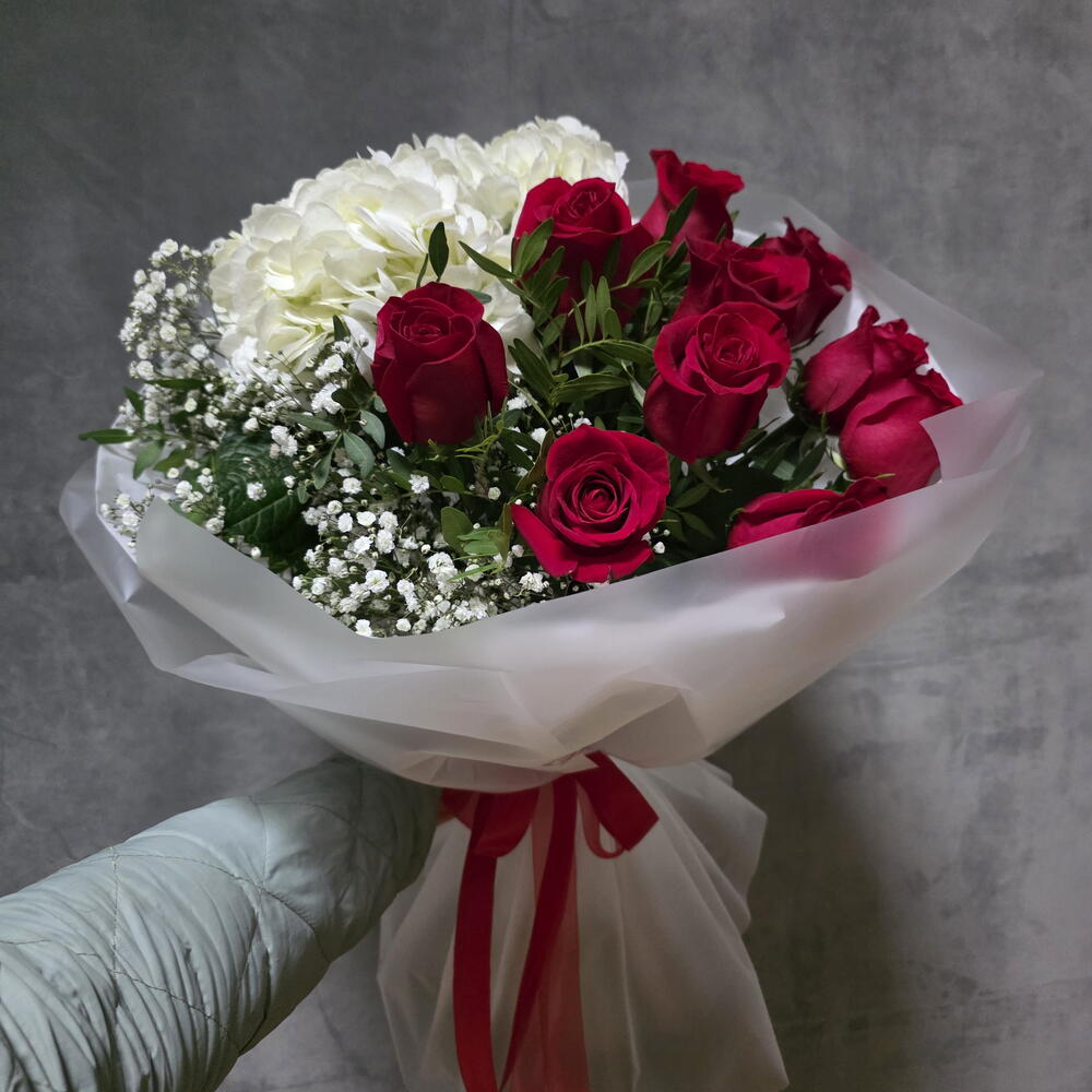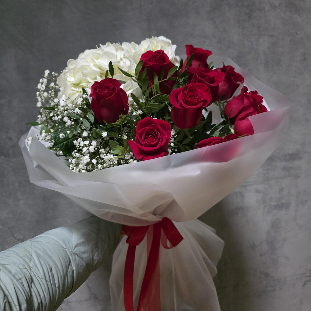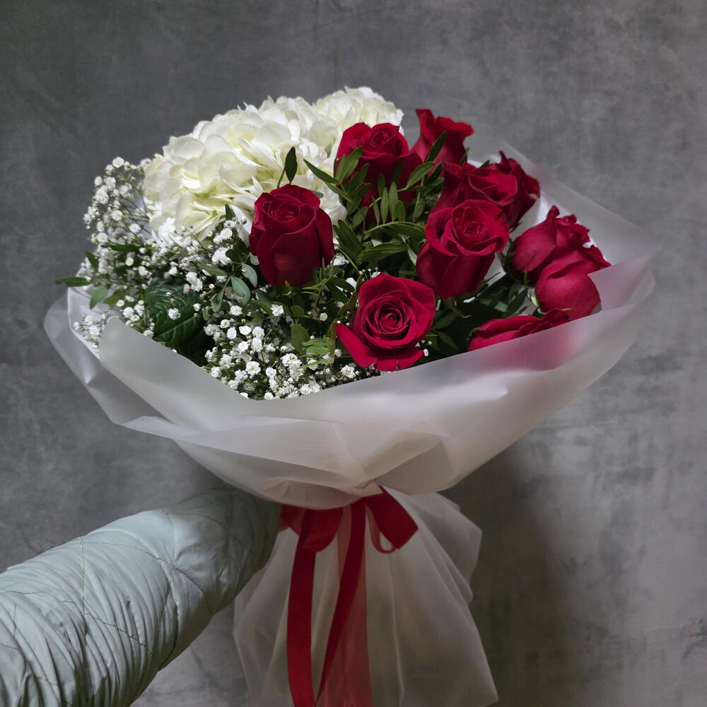 rosas rojas - 10 pcs paniculata blanca - 3 pcs envoltorio decorativo - 1 pcs white hydrangea - 2 pcs