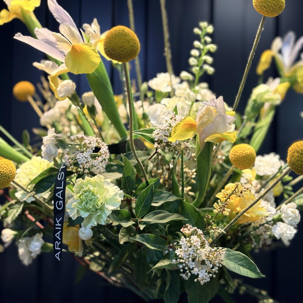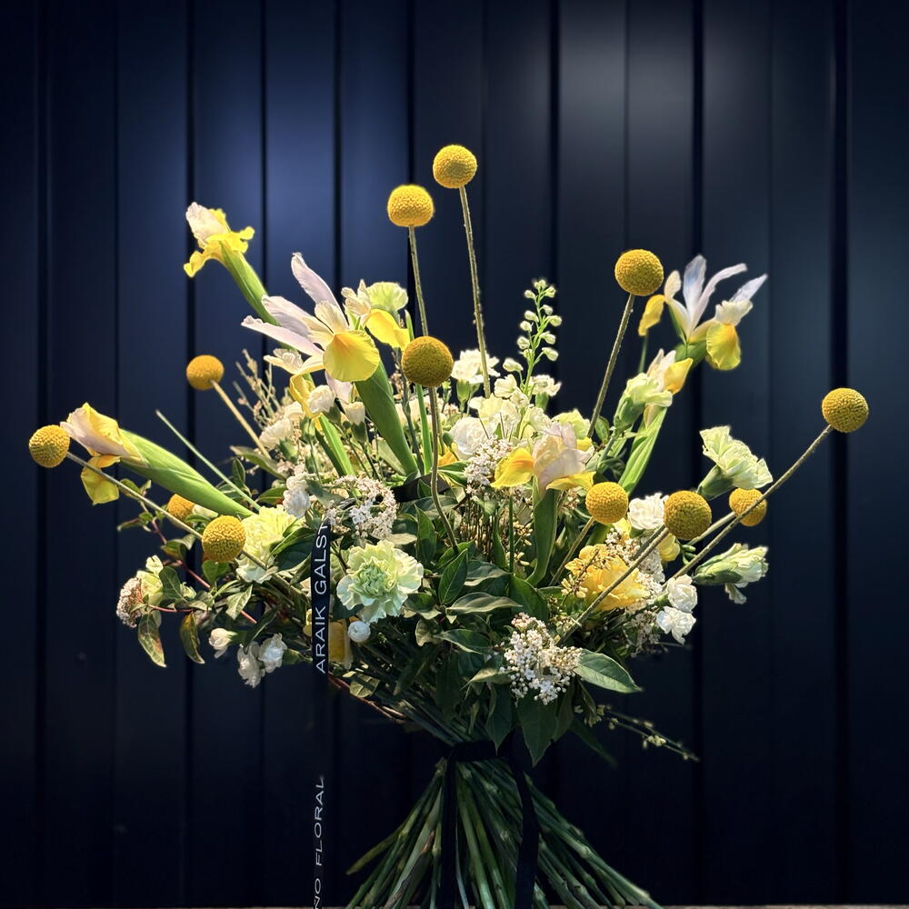 Iris - 6 pcs Viburnum - 2 pcs ranunculus - 2 pcs craspedia - 6 pcs delphinium - 1 pcs pink - 1 pcs clavel - 6 pcs broom - 2 pcs