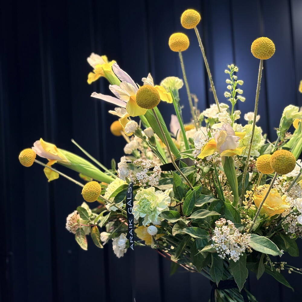 Iris - 6 pcs Viburnum - 2 pcs ranunculus - 2 pcs craspedia - 6 pcs delphinium - 1 pcs clavel - 6 pcs broom - 2 pcs