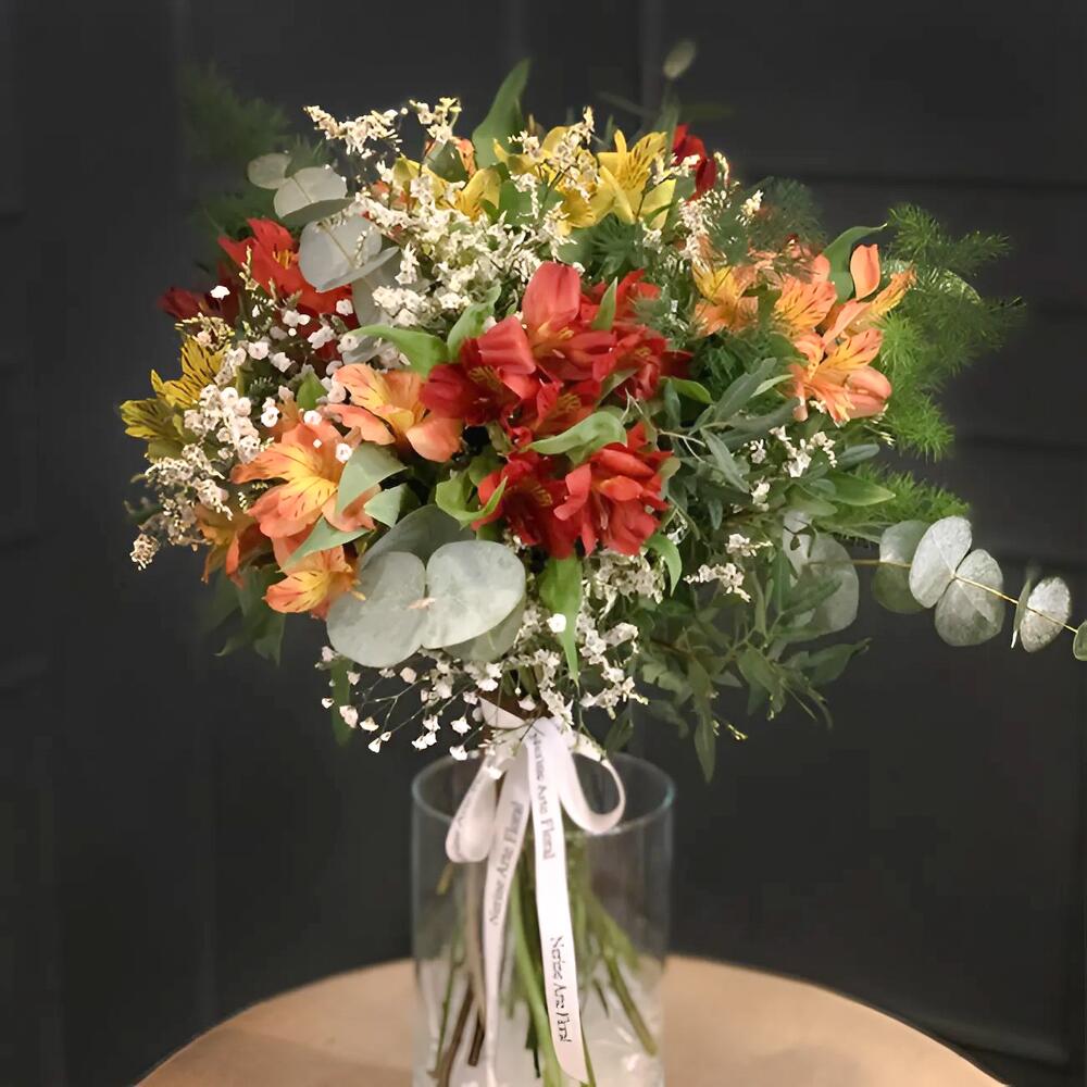 The Leonor Bouquet is a vibrant expression of joy and freshness. This wild bouquet is composed of a rich combination of multicolored alstroemerias (shades of red, orange, and yellow), accompanied by white gypsophila, which adds an ethereal and delicate touch. Touches of eucalyptus cinerea and feathery greenery complete the bouquet, giving it volume, texture, and a natural, light presence. Care Instructions: To keep the bouquet in optimal condition, place the stems in clean water upon receipt and change the water every two days. Trim the ends of the stems diagonally and keep the bouquet in a cool place, avoiding direct sunlight and heat sources.
