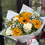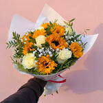 rosas blancas - 5 pcs girasoles - 10 pcs paniculata blanca - 2 pcs papel decorativo - 1 pcs fresh mastic - 3 pcs