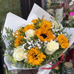 Este hermoso arreglo floral de autor se compone de 5 elegantes rosas blancas, 10 brillantes girasoles y delicadas paniculatas blancas. Acentuado con 3 ramas de lentisco fresco para agregar un toque de verde fresco y envuelto en papel decorativo para un regalo verdaderamente especial. Este es el regalo perfecto para expresar tus sentimientos más puros.