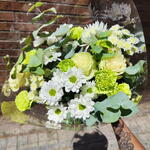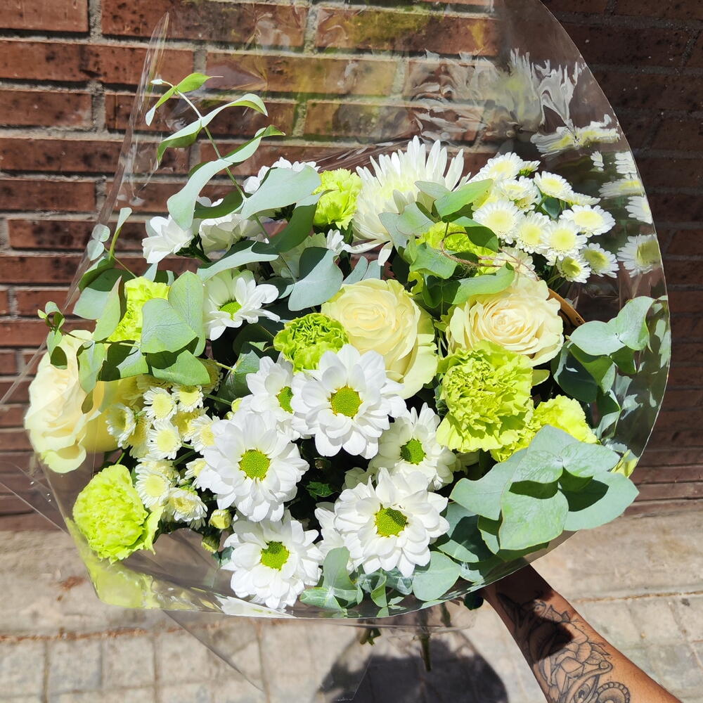 rosa blanca - 3 pcs eucalipto cinerea - 4 pcs green carnation - 6 pcs white daisy - 2 pcs anastasia blanca - 1 pcs greenish-white Santini daisy - 2 pcs