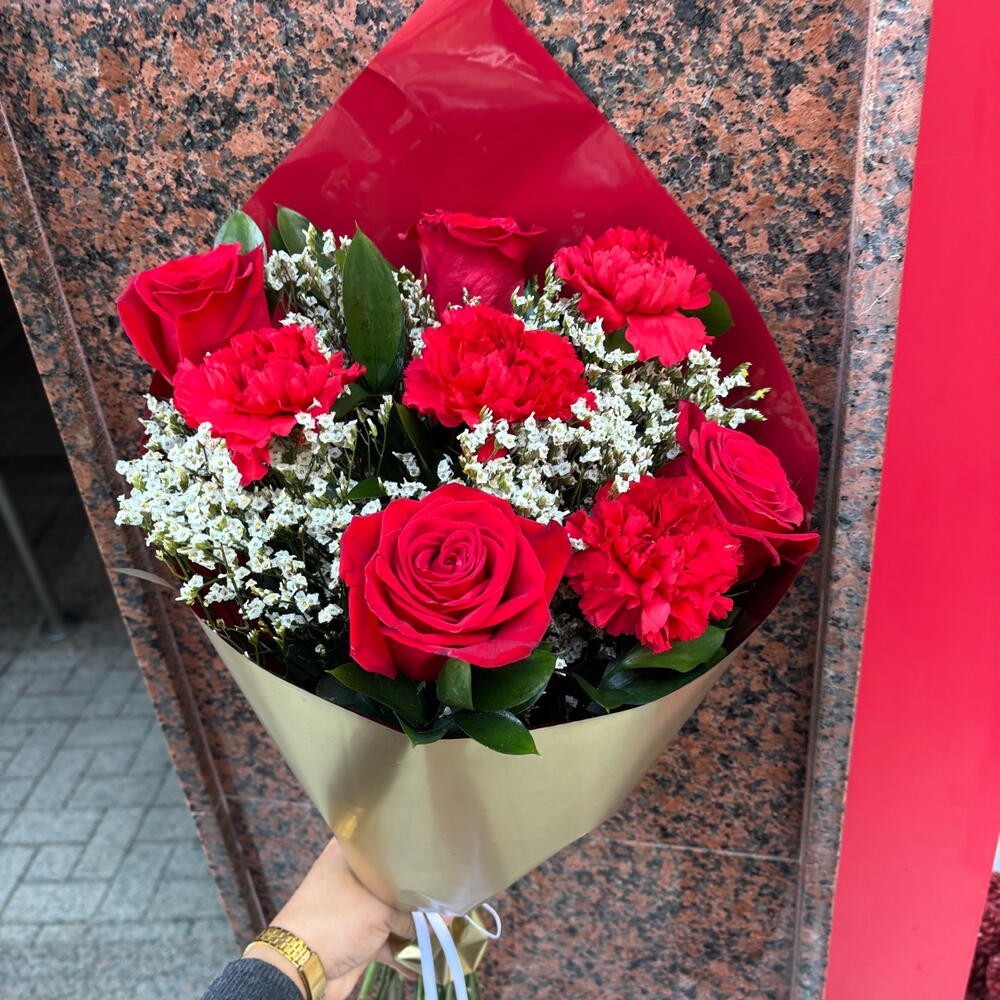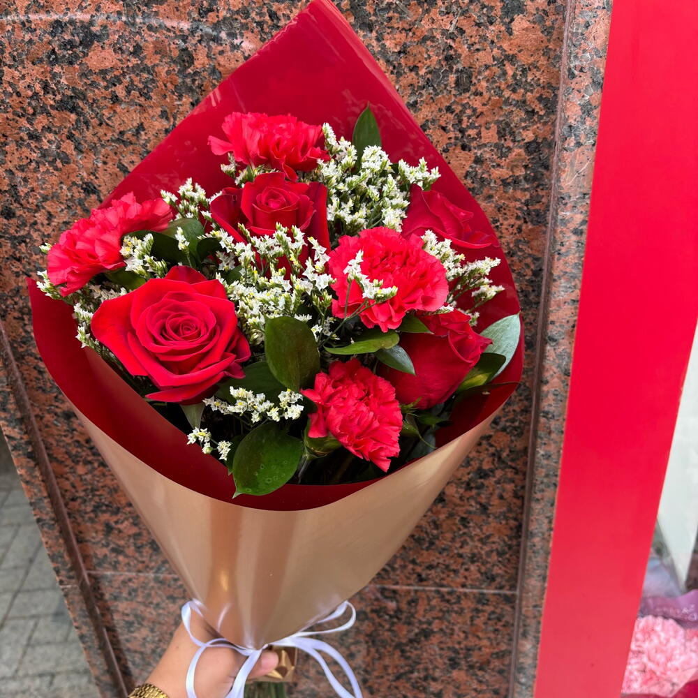 Discover the magnificence and elegance of the Classic Bouquets. Composed of 6 pcs of Ruscus, which adds a natural, wild touch. It also incorporates 4 pcs of roses, the eternal symbol of love and passion. In addition, it includes 4 pcs of carnations, flowers of luminous beauty and durability. Finally, it contains 3 pcs of limonium, which create a delicate and elegant scene. Achieve a perfect harmony between classic and modern style, ideal for gifting on any occasion.