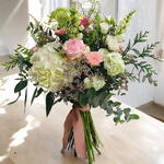 This exquisite bouquet combines the delicacy of pastel-toned roses with the elegance of hydrangeas and a touch of wildflowers. The freshness of eucalyptus and the green accents enhance the composition, creating a balanced and harmonious arrangement. Ideal for any special occasion, this bouquet conveys serenity and sophistication in every detail. Perfect for decorating spaces or surprising someone special with a gesture full of tenderness and good taste. Its presentation, with a soft natural ribbon, adds a touch of rustic charm that makes it unique. A perfect choice to express your most sincere feelings!