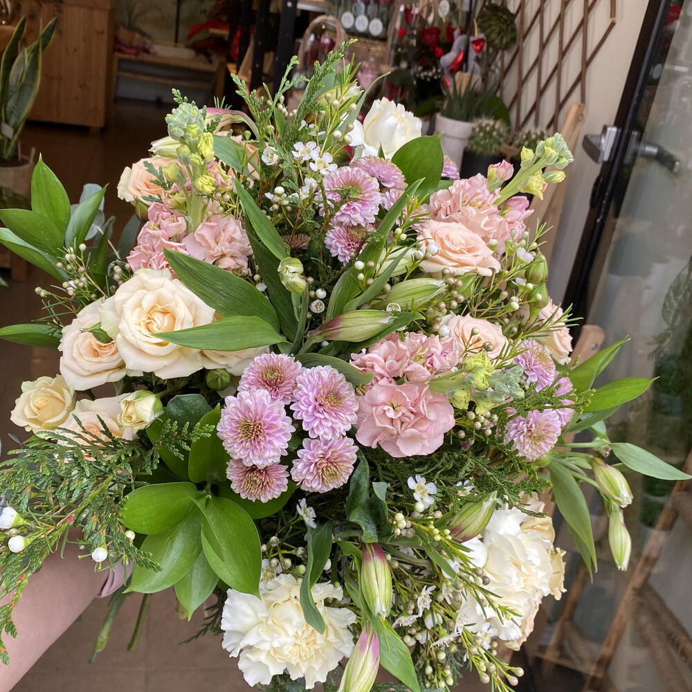 follaje verde - 4 pcs clavel - 2 pcs rose spray - 4 pcs margarita - 4 pcs follaje - 3 pcs envoltorio decorativo - 1 pcs lazada - 1 pcs alstroemerias - 3 pcs stock - 3 pcs