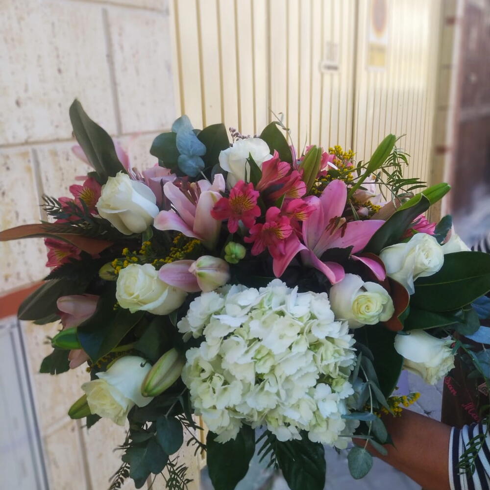 This elegant bouquet combines a central white hydrangea that adds volume and prominence with pink lilies that convey delicacy and a romantic air. The white roses add sophistication and balance, while the pink-toned alstroemerias reinforce the sense of freshness and harmony. The yellow filler flowers provide small accents of color and the varied greens create a lush, natural base that gives structure to the arrangement. This gift bouquet is ideal as flowers for a woman, a birthday bouquet, or flowers for a special occasion. Its refined style makes it an exclusive bouquet, perfect as a romantic floral arrangement and as modern floral decoration full of elegance and sensitivity.