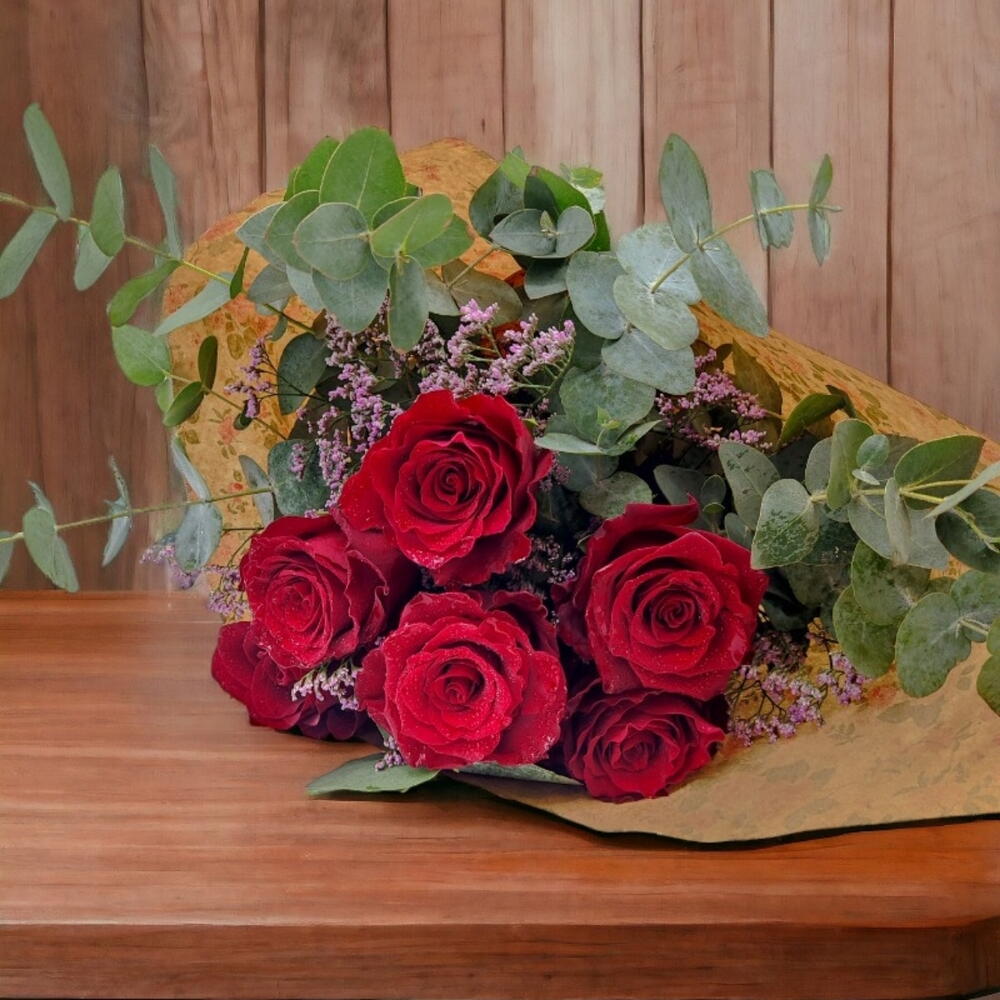 It consists of a bouquet of 6 red Roses, pink Limonium, Eucalyptus, and is wrapped in gift paper and a red ribbon.