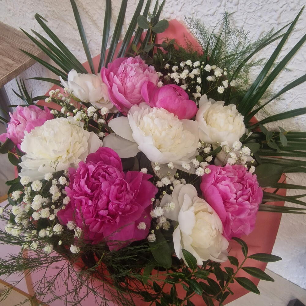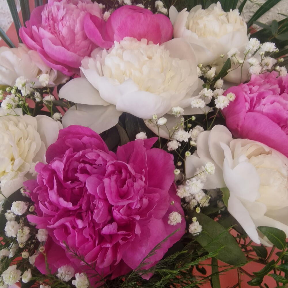 Exclusive arrangement of fresh peonies in white and pink tones. A seasonal flower with voluminous petals and a silky texture that instantly adds body and elegance. White brings light and purity, pink adds a romantic, natural touch. Together they create a sophisticated, full, and very feminine bouquet. Ideal for brides, anniversaries, special thank-yous, or when you want to give a seasonal flower.