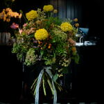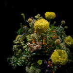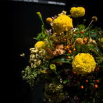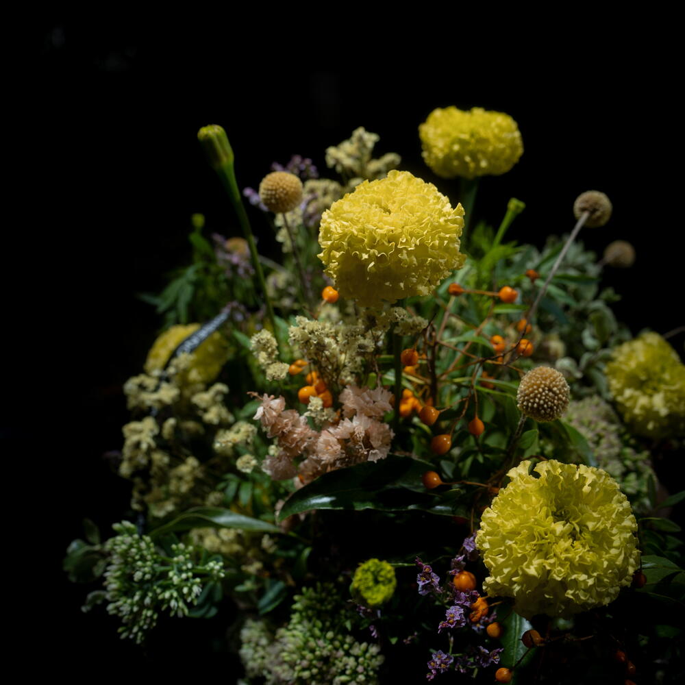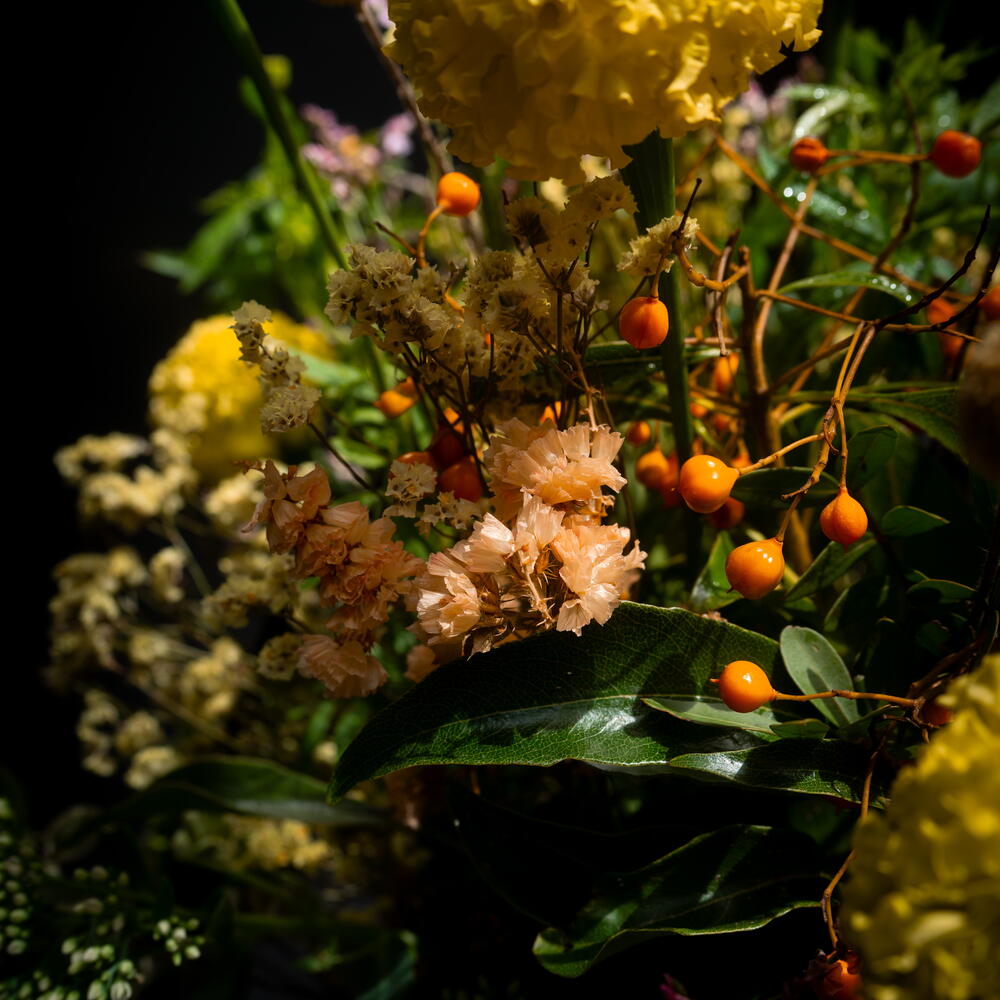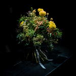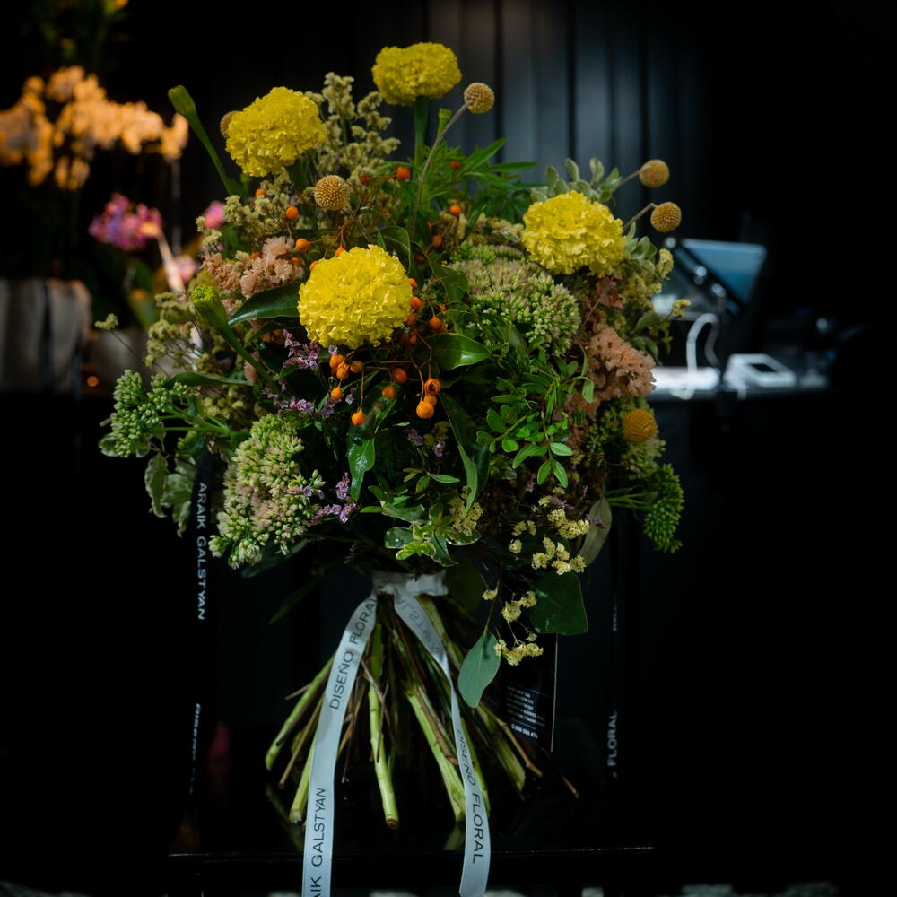 This bouquet is like a gentle symphony of light in the midst of darkness. The warm yellow flowers shine delicately, like small solar lanterns, while around them unfolds a luxurious natural palette: woodland and delicate hues, an aromatic green, tiny berries and airy textures.