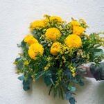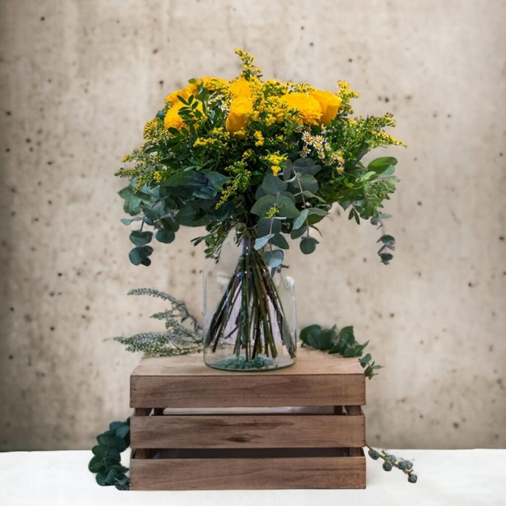 eucalyptus - 5 pcs yellow solidago - 5 pcs rosa amarilla - 5 pcs yellow anastasia - 5 pcs white santini chrysanthemum - 3 pcs