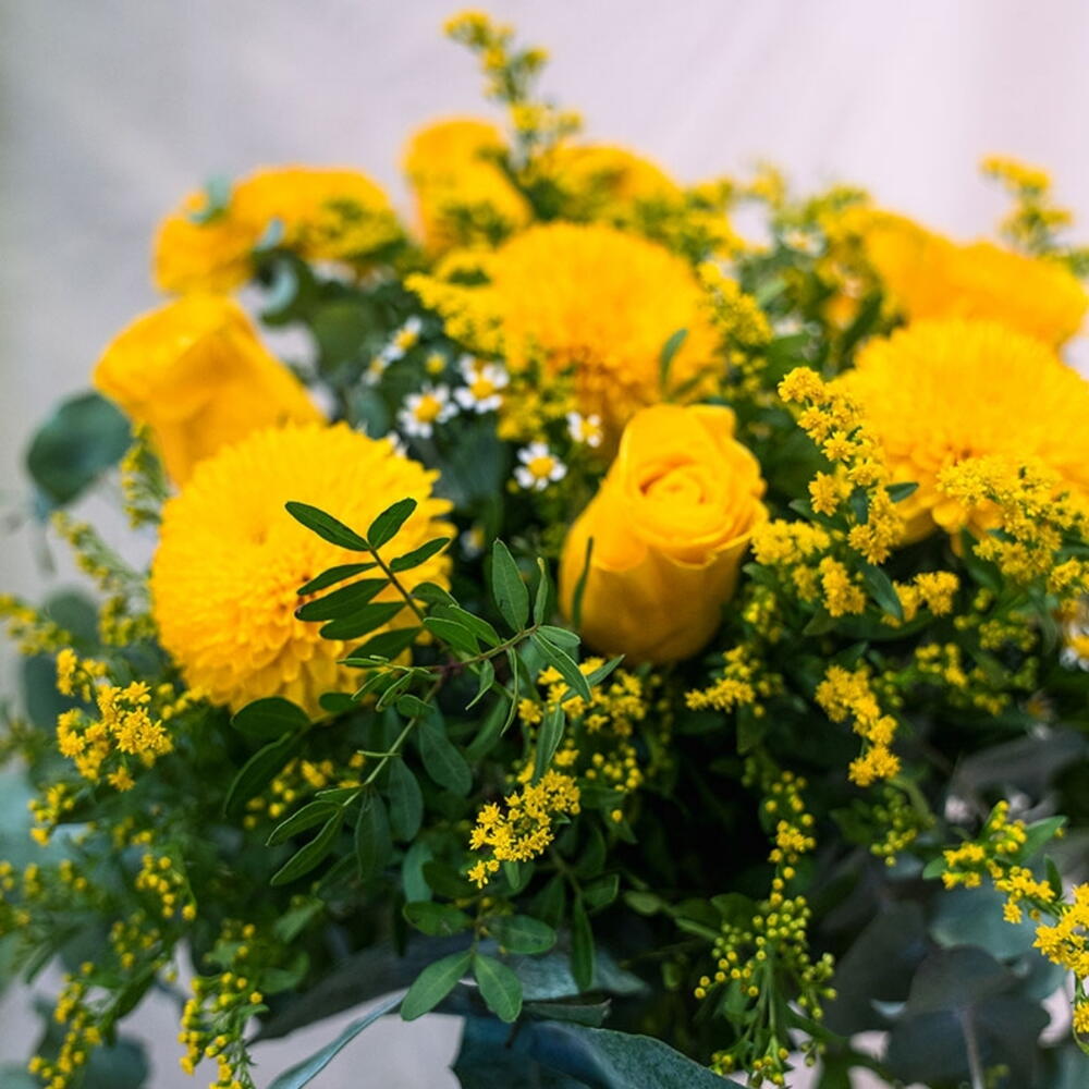 Bouquet of fresh flowers in shades of yellow. Flowers: Yellow roses, anastasias, tanacetum, solidago, and various varieties of greenery.